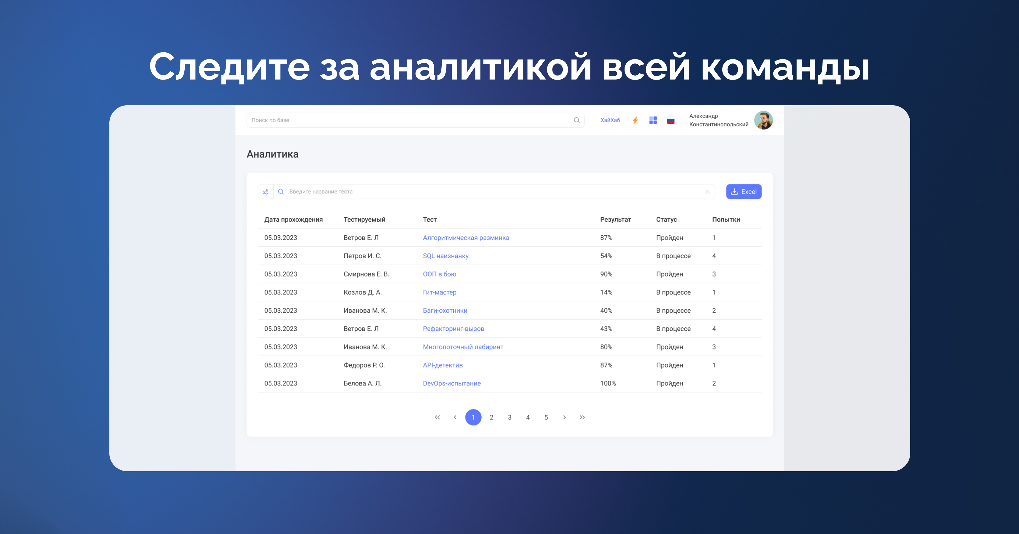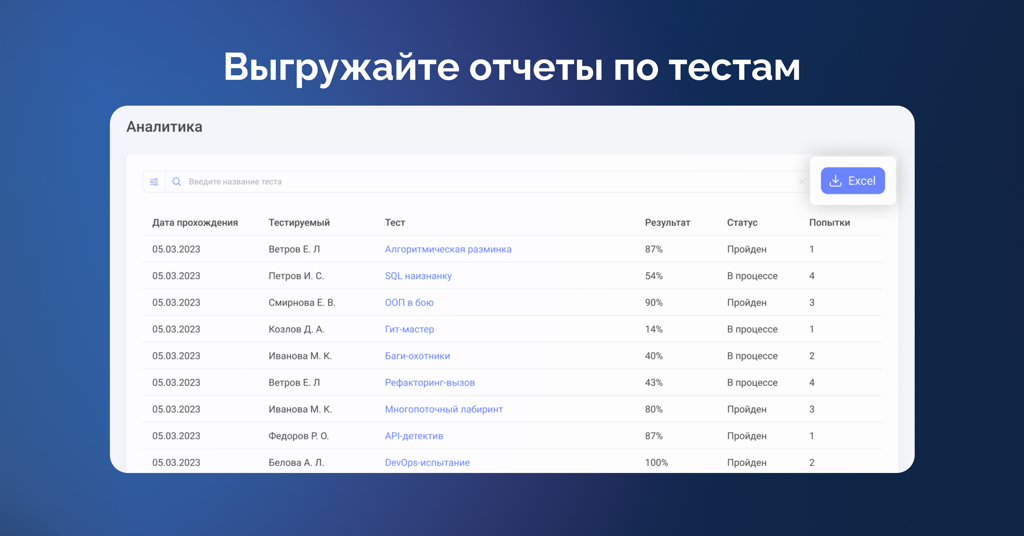 - Просматривайте аналитику по тестам: прогресс прохождения и результаты