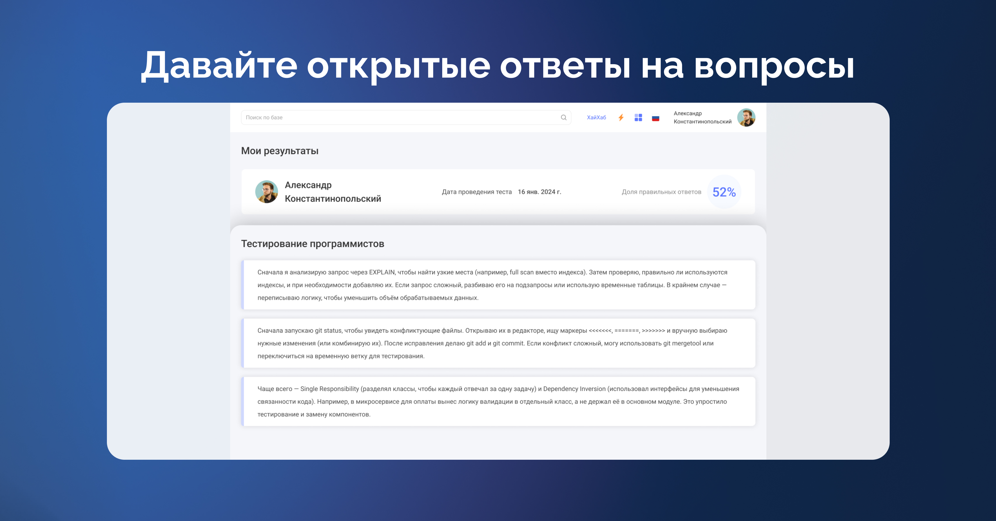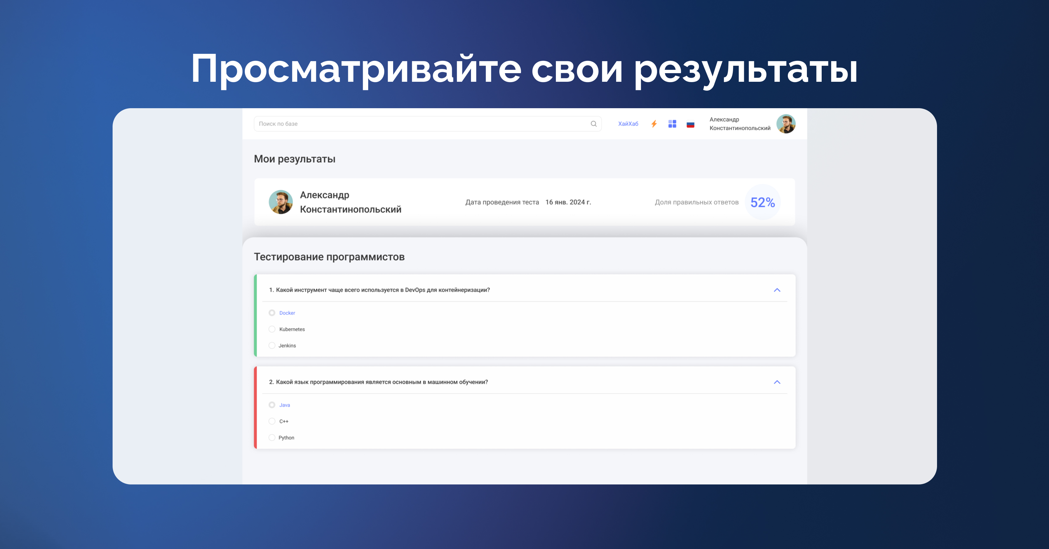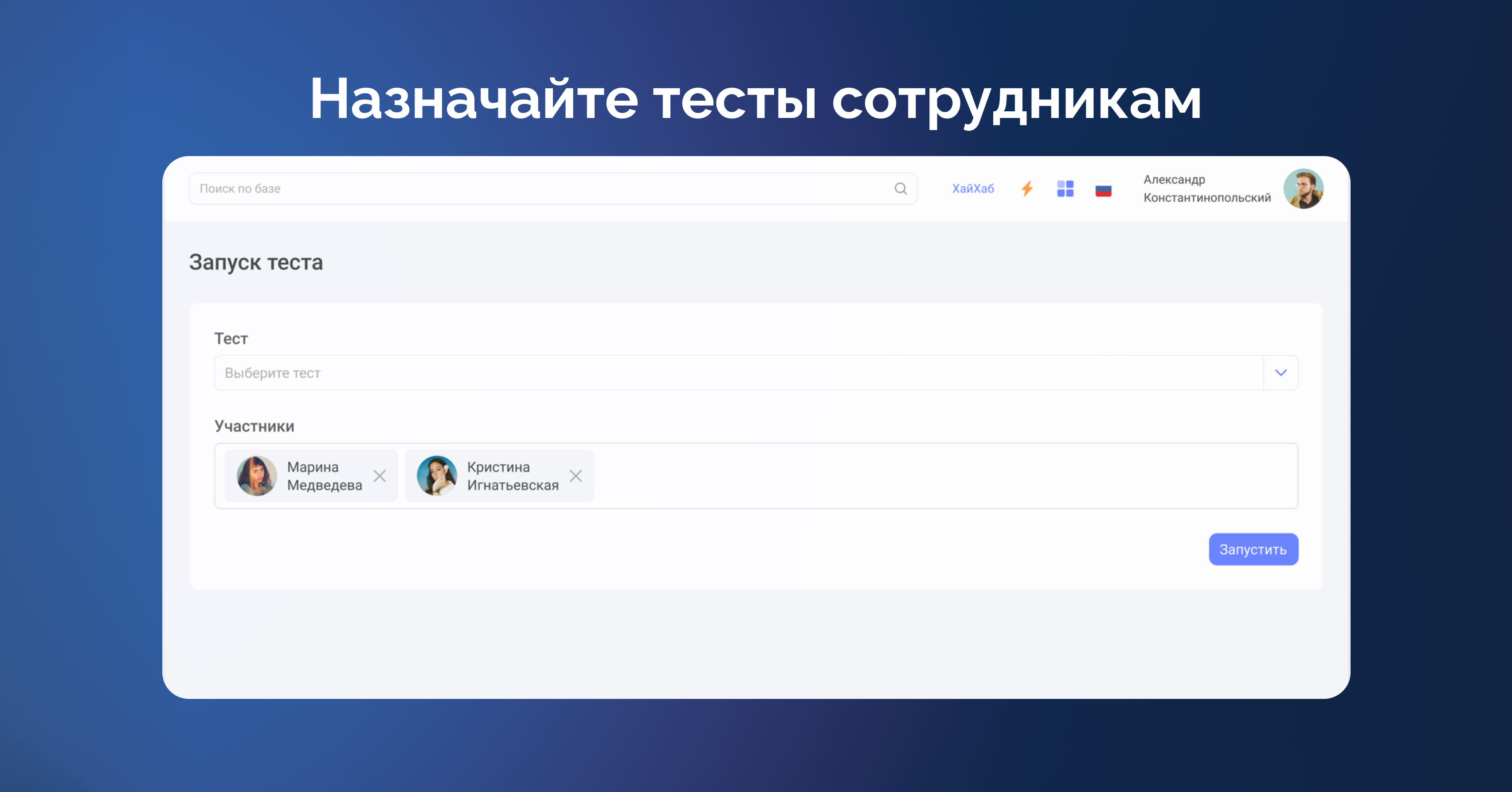 Сервис является частью ХайХаба — системы для управления человеческим капиталом, знаниями и информацией в компании. Тестирование эффективно работает в связке с приложениями «База знаний» и «Обучение».