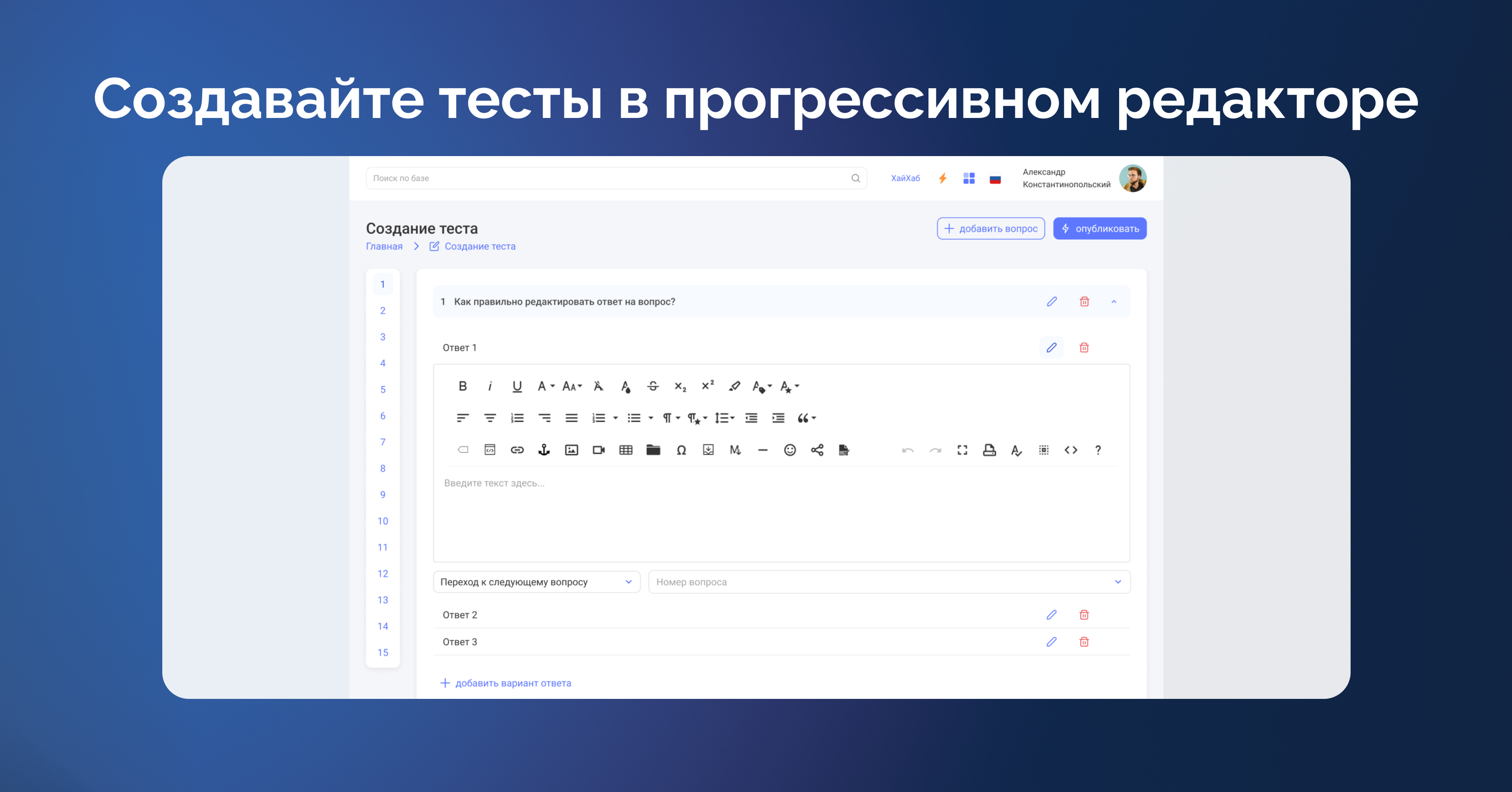 Создавайте тесты в простом редакторе. Вносите вопросы и варианты ответов, прикрепляйте к тестам все необходимые материалы благодаря визуальному редактору.