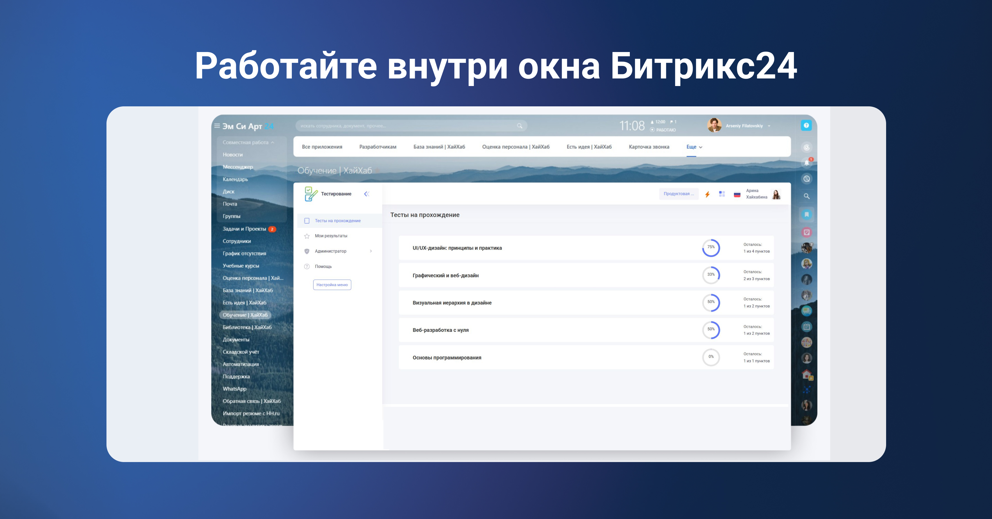 Доступ к тестам возможен с любого устройства через портал вашей компании в Битрикс24: ПК, телефон или планшет.