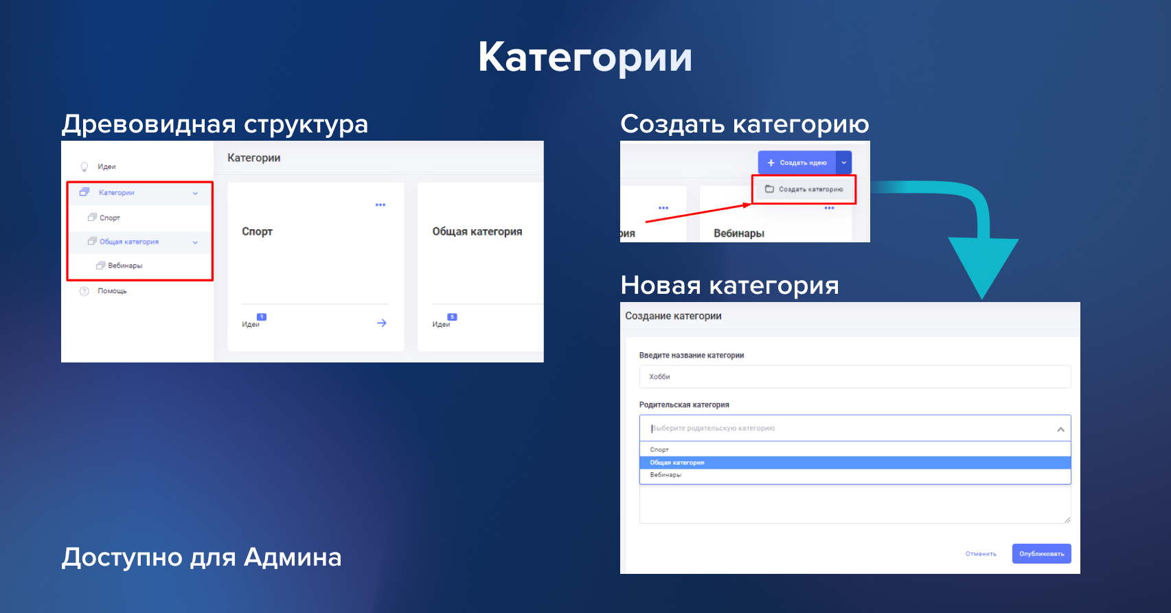 - Категории идей. Можно создать древовидную структуру категорий для своей компании: спорт, обучение, офис, корпоративны, фирменный стиль, сервис