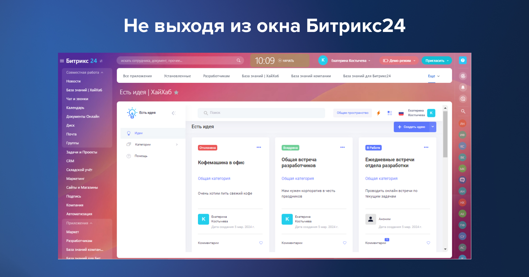 Приложение «Есть идея» (банк идей) позволит вашим сотрудникам публиковать неограниченное количество идей для развития компании, обсуждать их и прослеживать процесс внедрения. Установите сервис на свой портал, и он сразу будет готов к работе.
