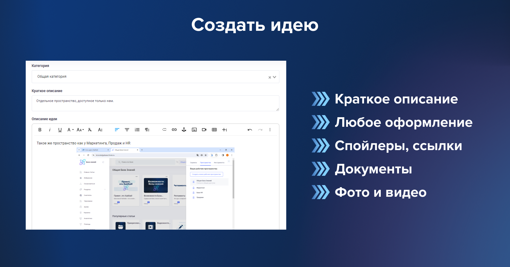 - Красочное оформление идеи. Можете прикрепить к идее файлы, видео, изображения, таблицы и многое другое