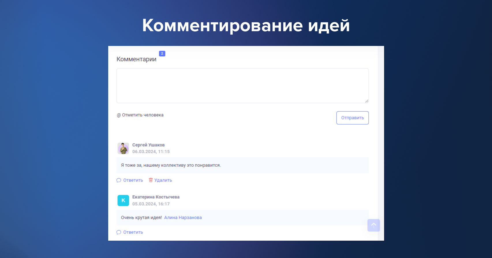 - Все созданные с помощью сервиса идеи могут просматривать другие сотрудники, комментировать их и ставить лайки