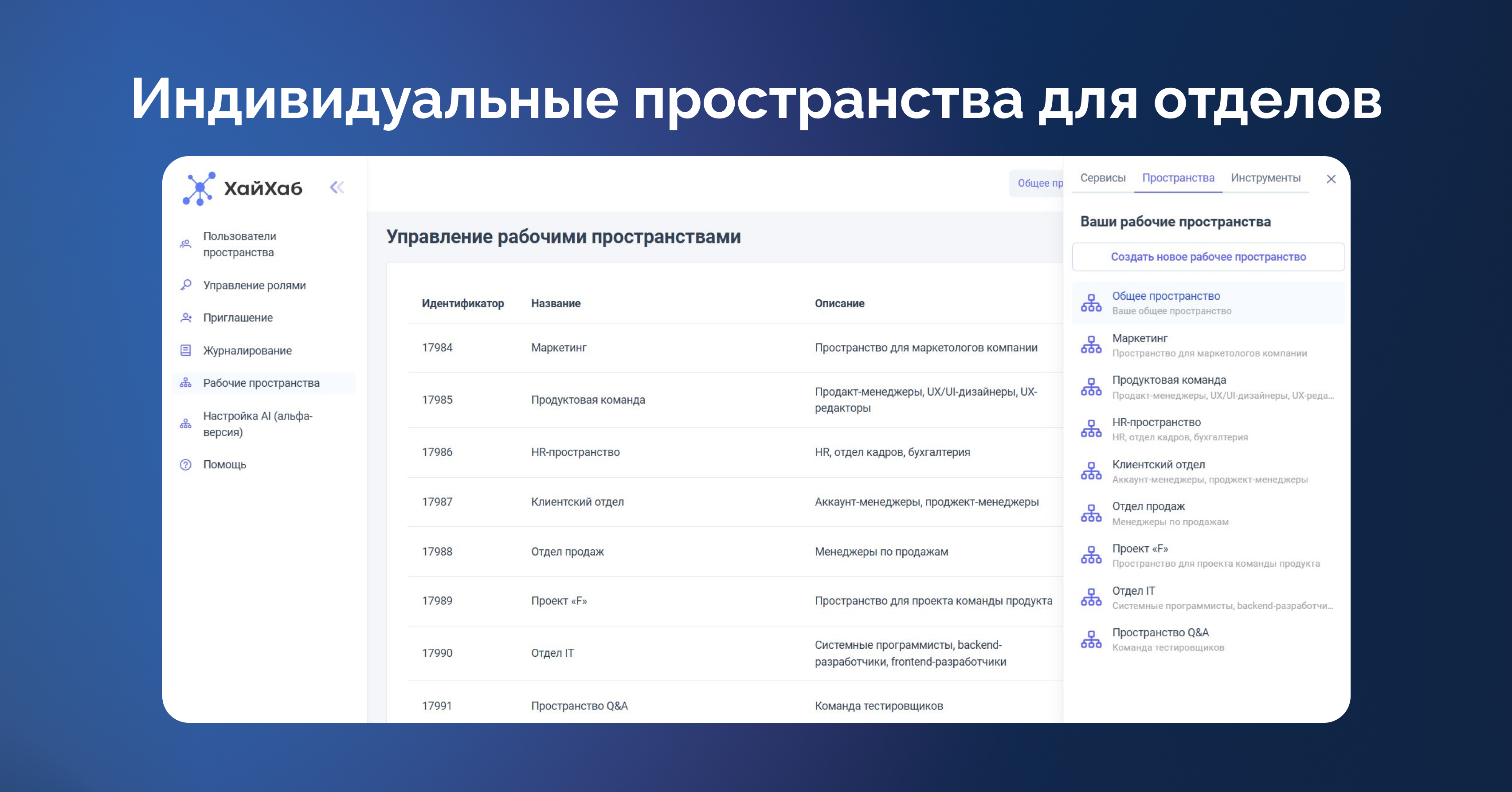 Пространства в Базе знаний ХайХаба позволяют разделить информацию для отдельных групп пользователей (по проектам или отделам). Информация в пространстве видна только тем сотрудникам, которые в него добавлены. Доступ к Общему пространству Базы знаний есть у всех авторизованных пользователей.