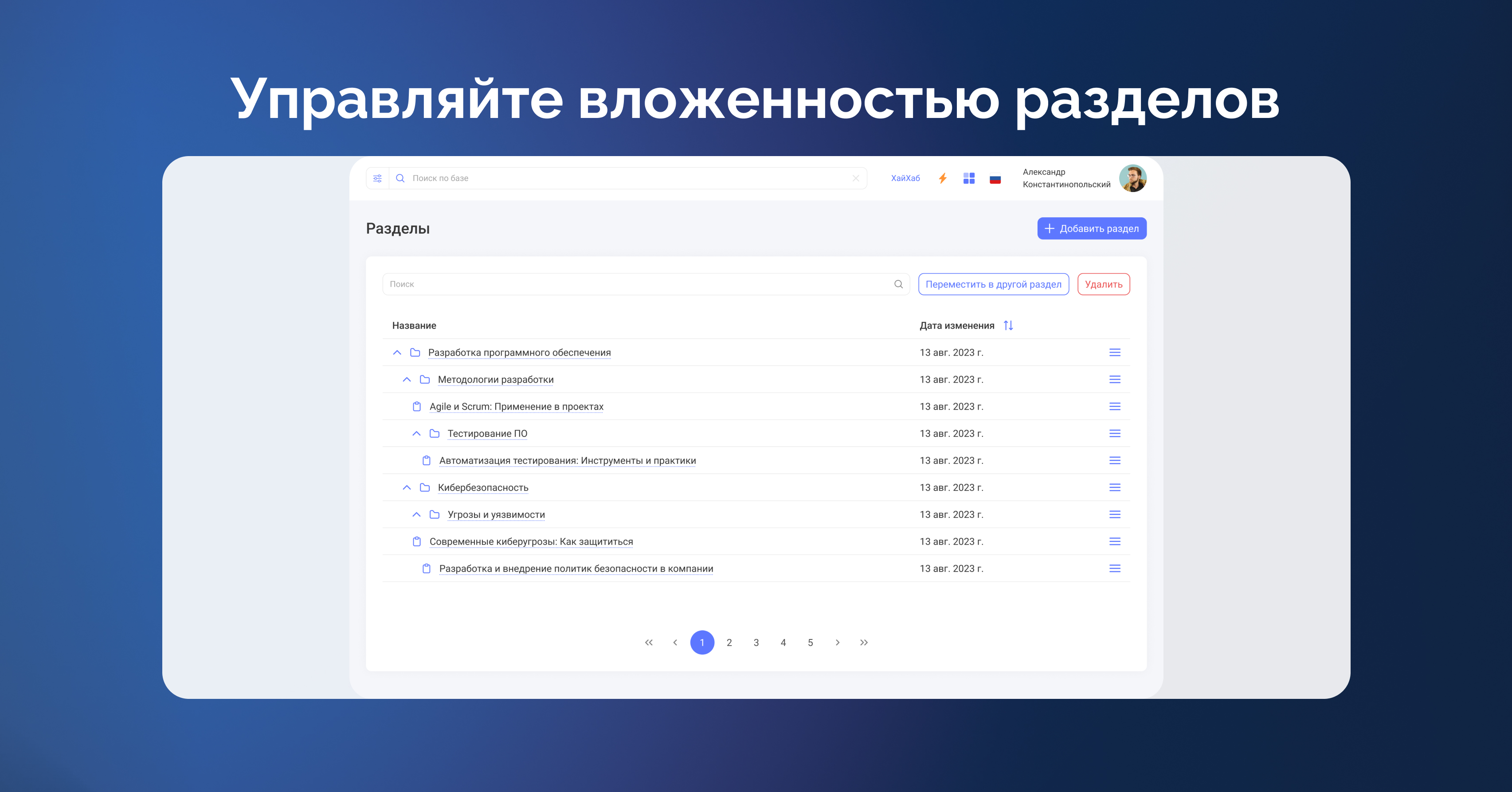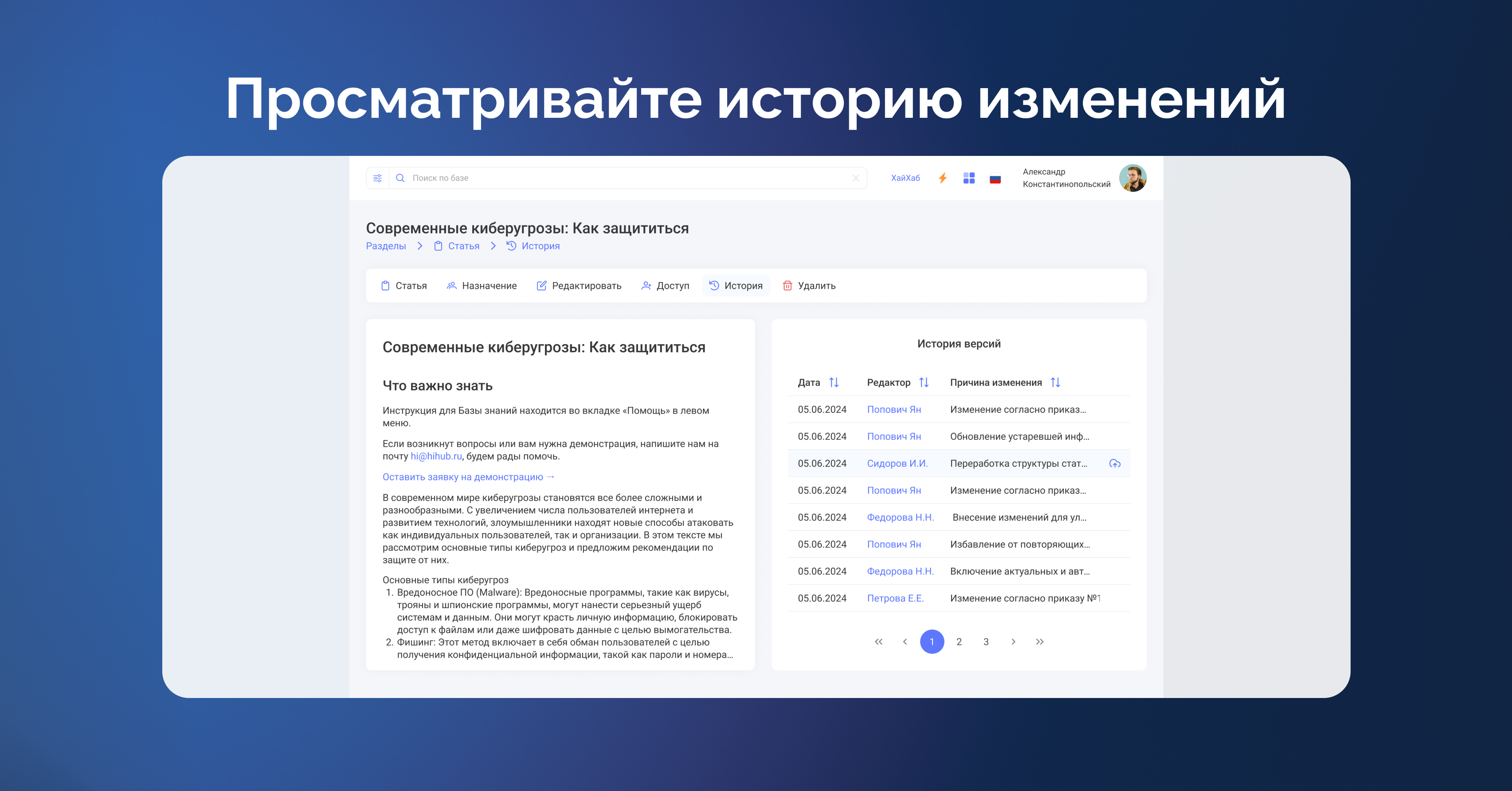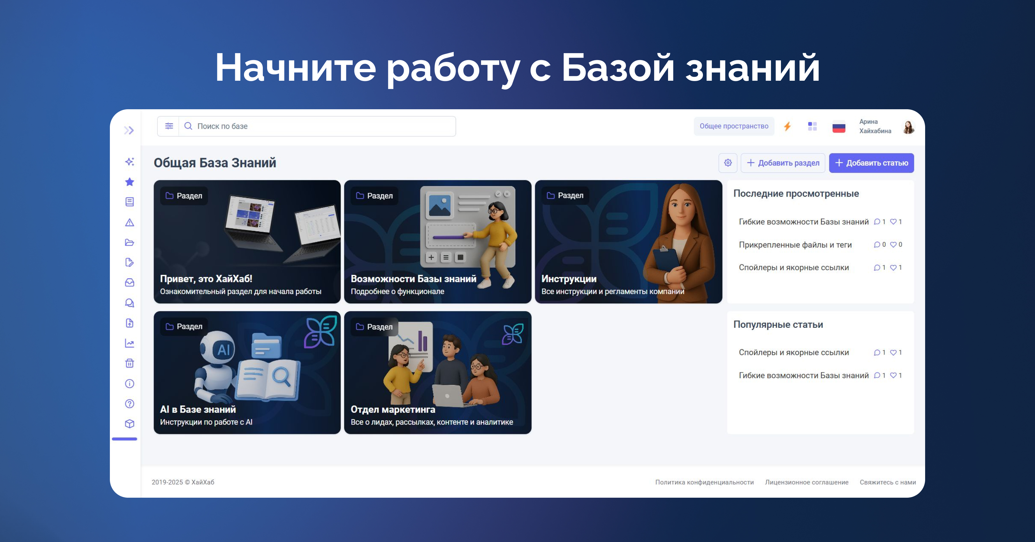 Подробная инструкция для Базы знаний с демонстрацией функционала: https://start.hihub.ru/manuals/knowledgebase-instruction/