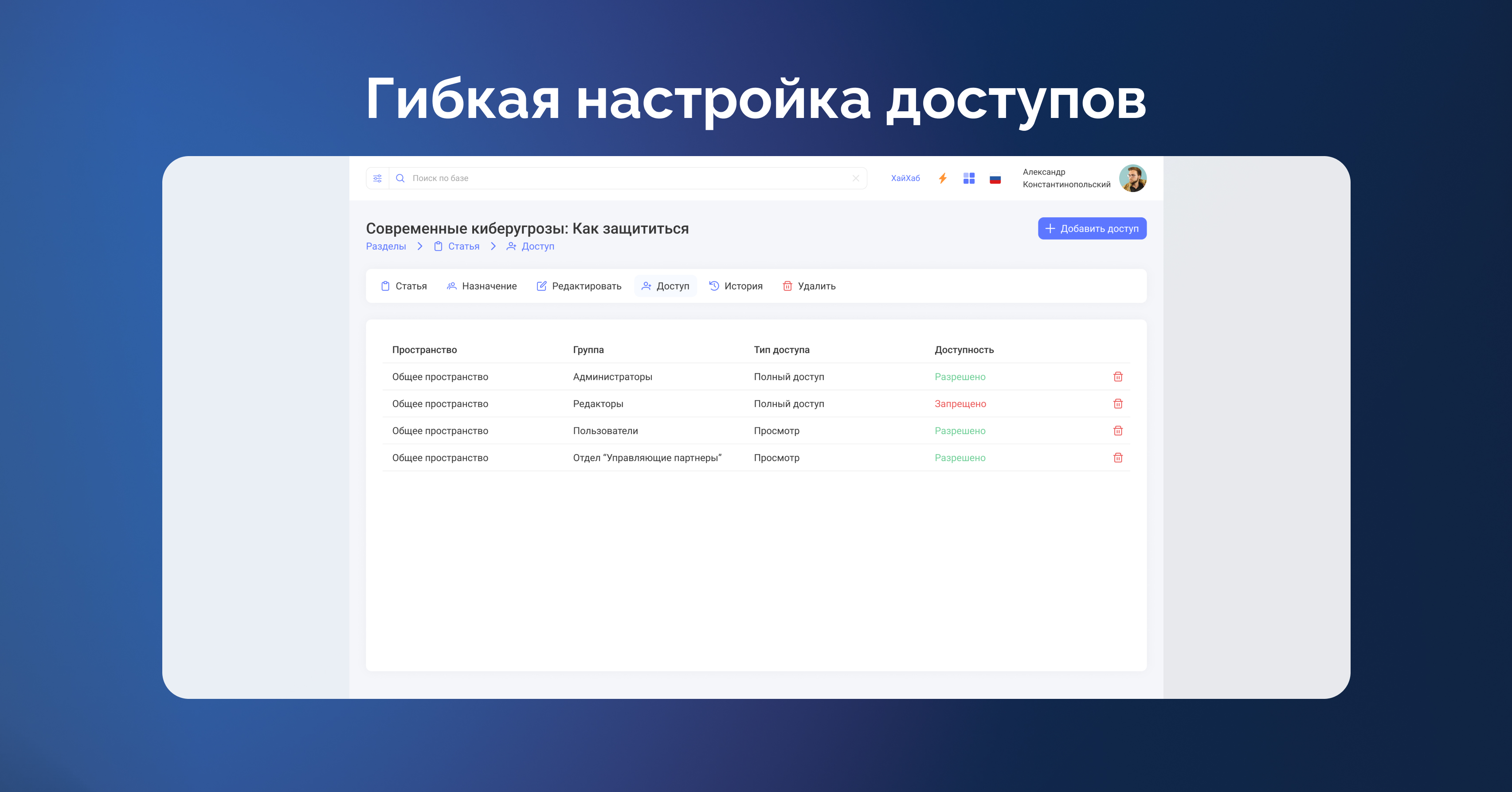 - Администратор — полный доступ ко всем статьям и разделам, управление ролями и доступами, создание и редактирование пространств, доступ к аналитике и журналированию (отчет о прочтениях статей, создании, редактировании и удалении) и др.