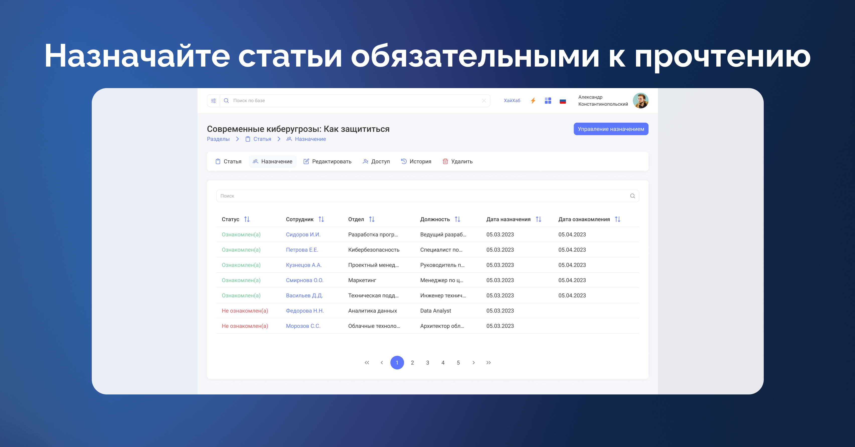 Назначайте статьи обязательными к прочтению определенной группе людей: департаментам, должностям и компетенциям или конкретным сотрудникам.