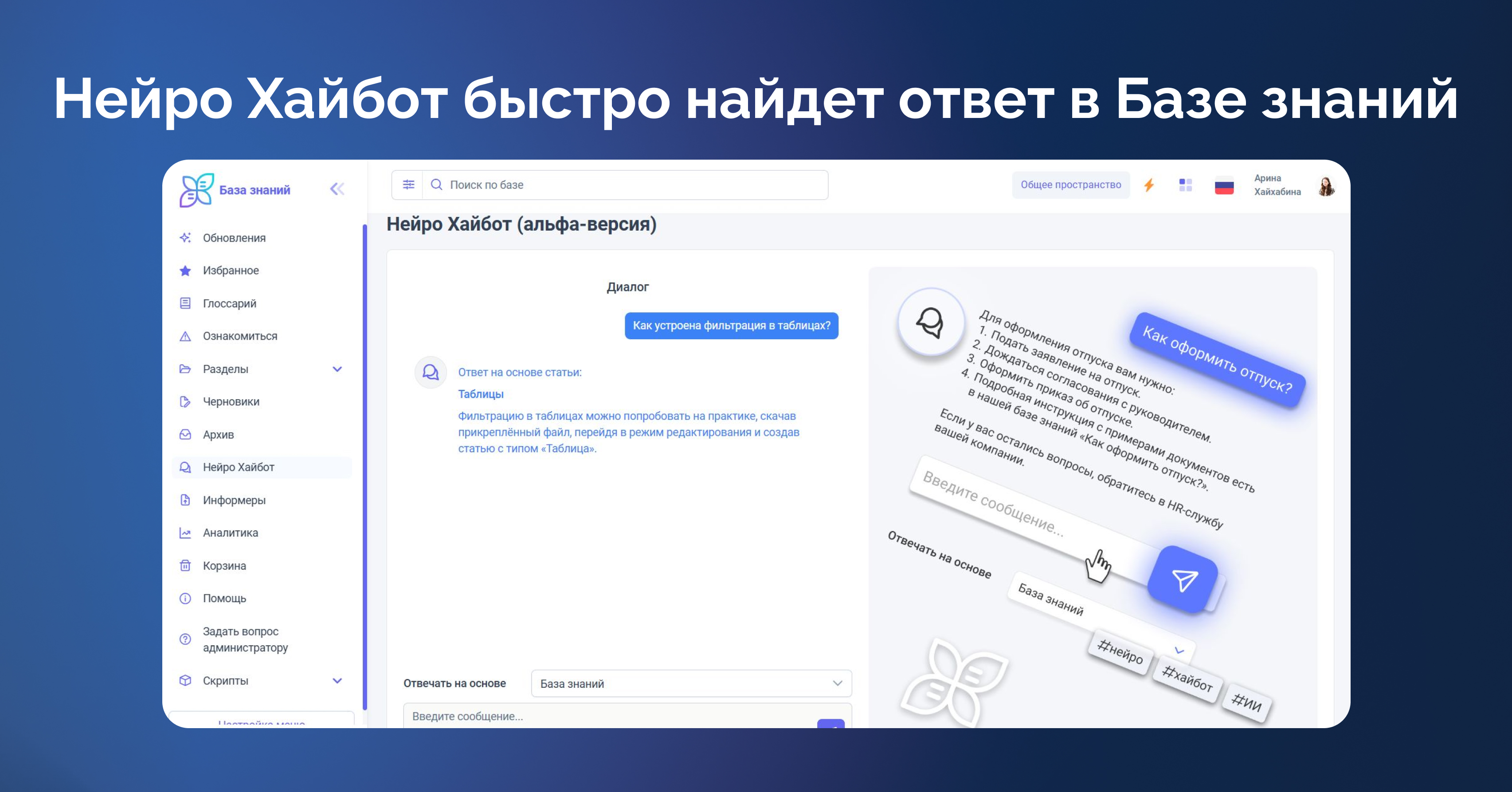 Задавайте вопросы Нейро Хайботу, и он поможет найти ответ на основе вашей Базы знаний;