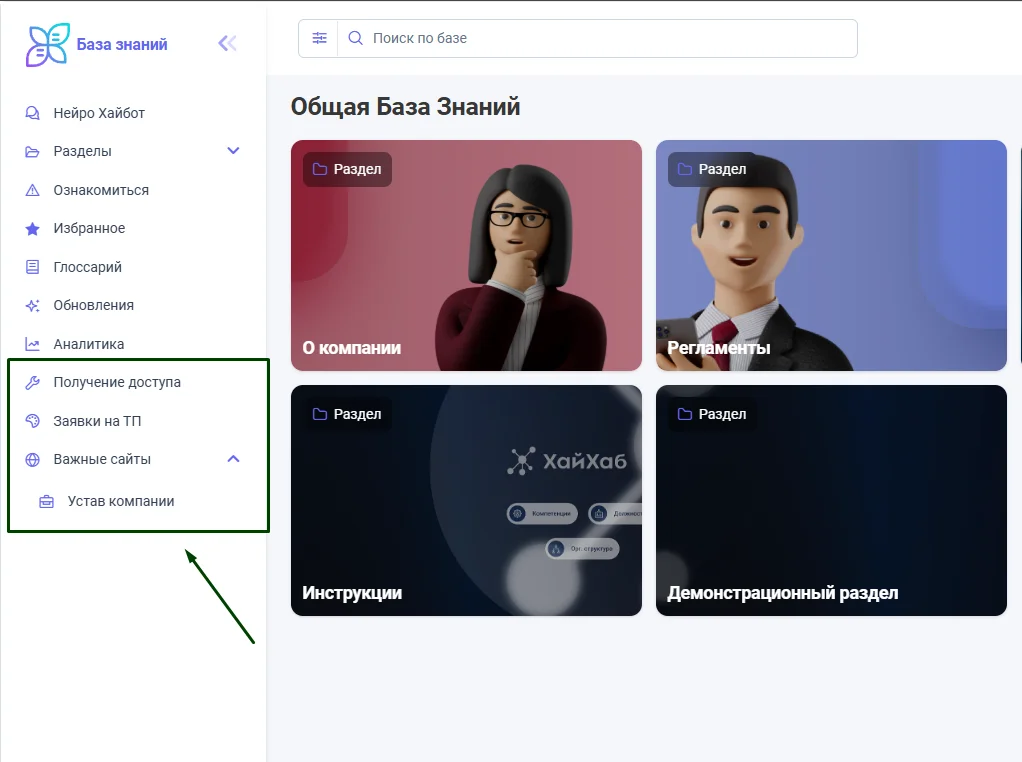 Подробная инструкция для Базы знаний с демонстрацией функционала: https://start.hihub.ru/manuals/knowledgebase-instruction/