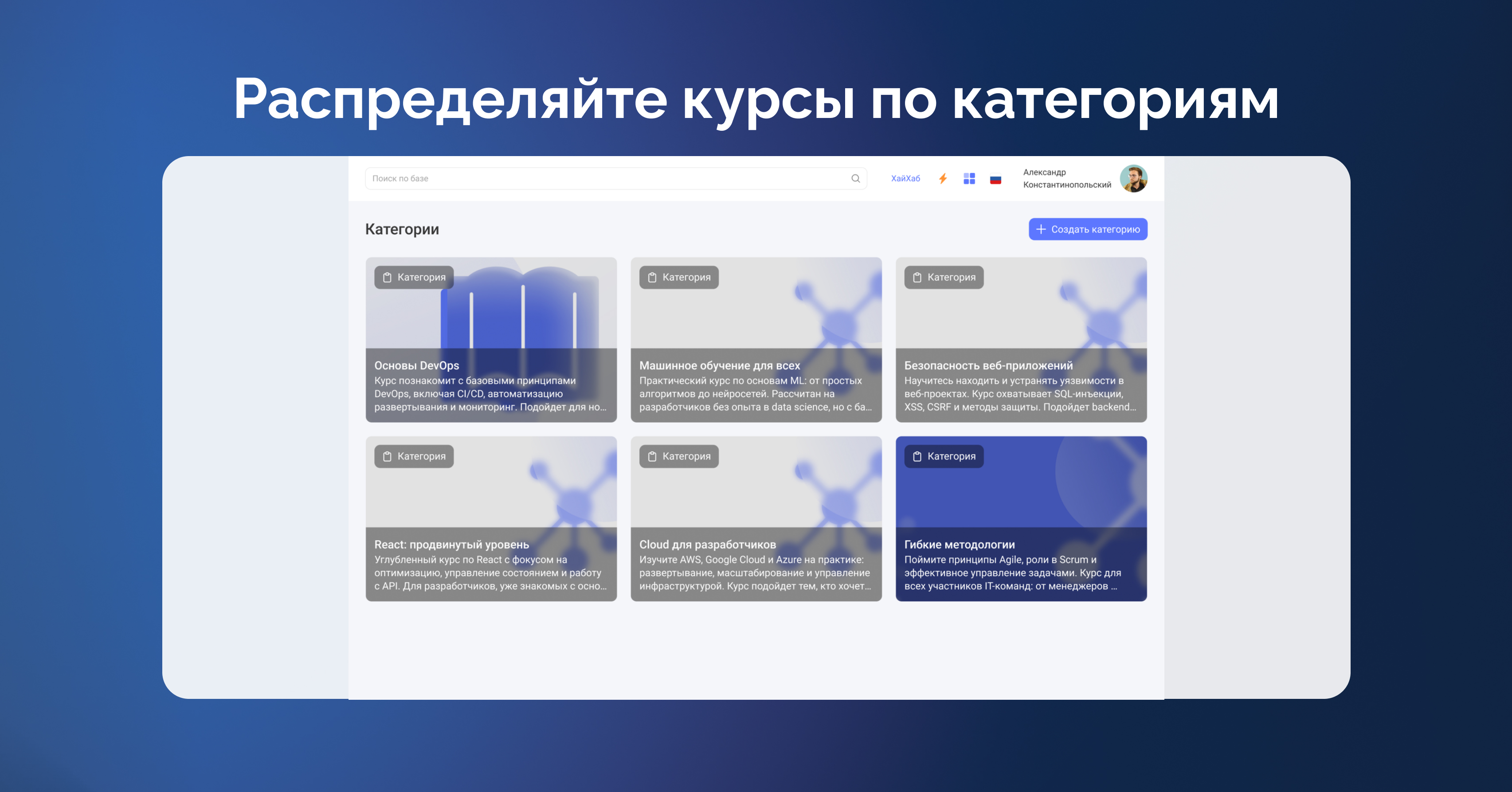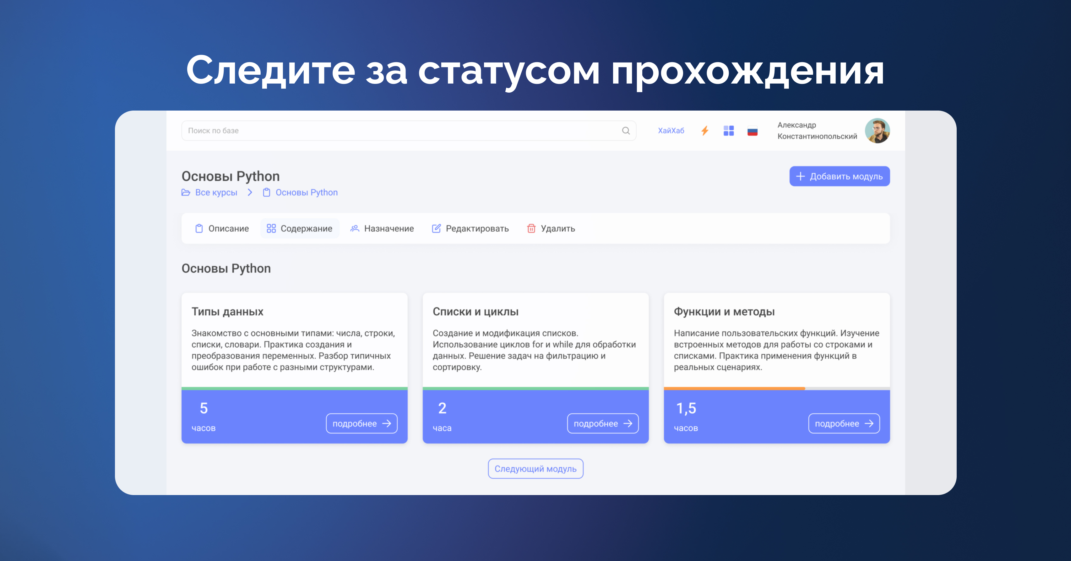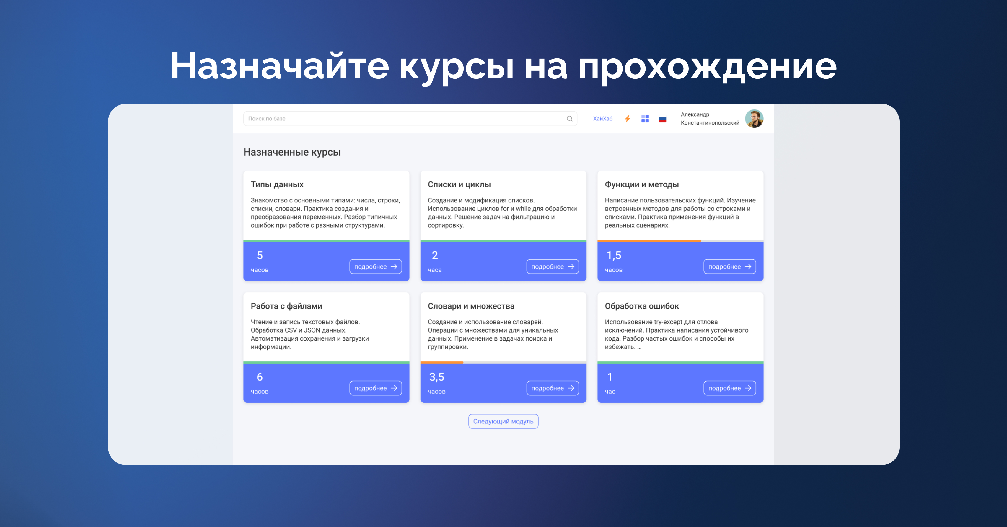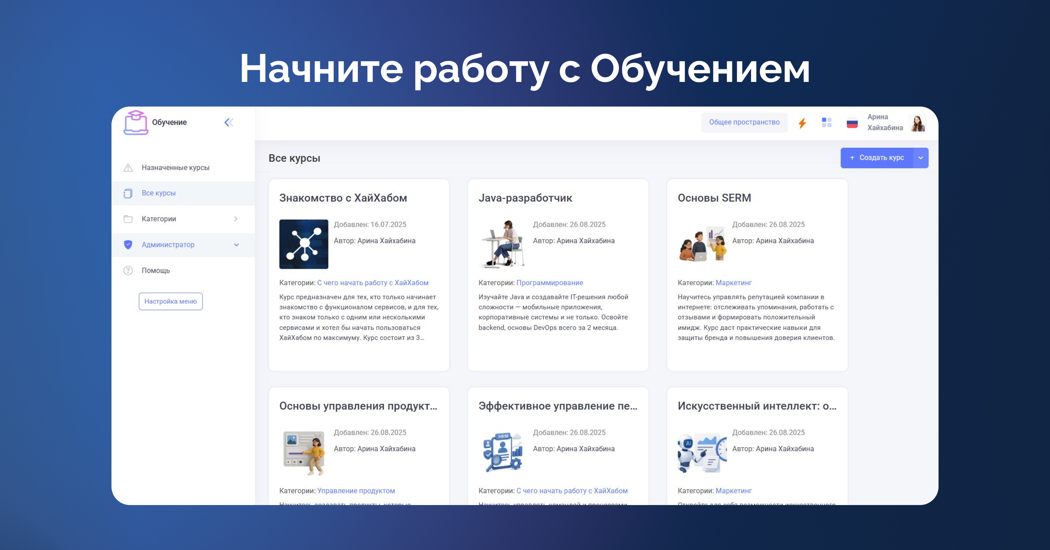 - Для вас будет доступен демокурс «Знакомство с ХайХабом», который поможет освоить функционал платформы. Создавайте свои курсы и наполняйте их контентом. Можно прикрепить к курсам тесты, предварительно опубликовав их внутри сервиса «Тестирование»