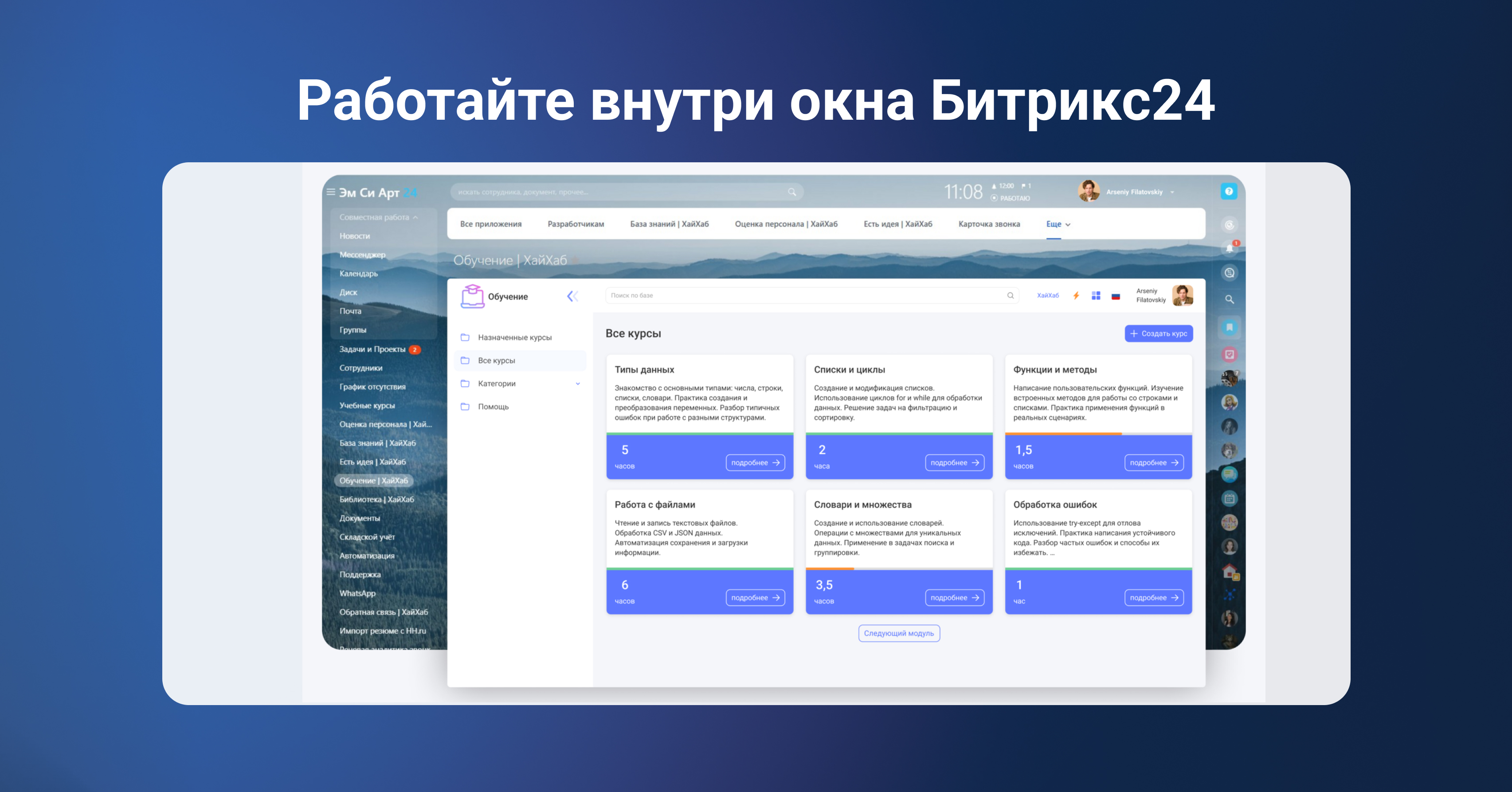 Приложение «Обучение» от ХайХаба помогает компаниям запускать корпоративные курсы с тестированием любого формата: от адаптации новичков до развития профессиональных компетенций.