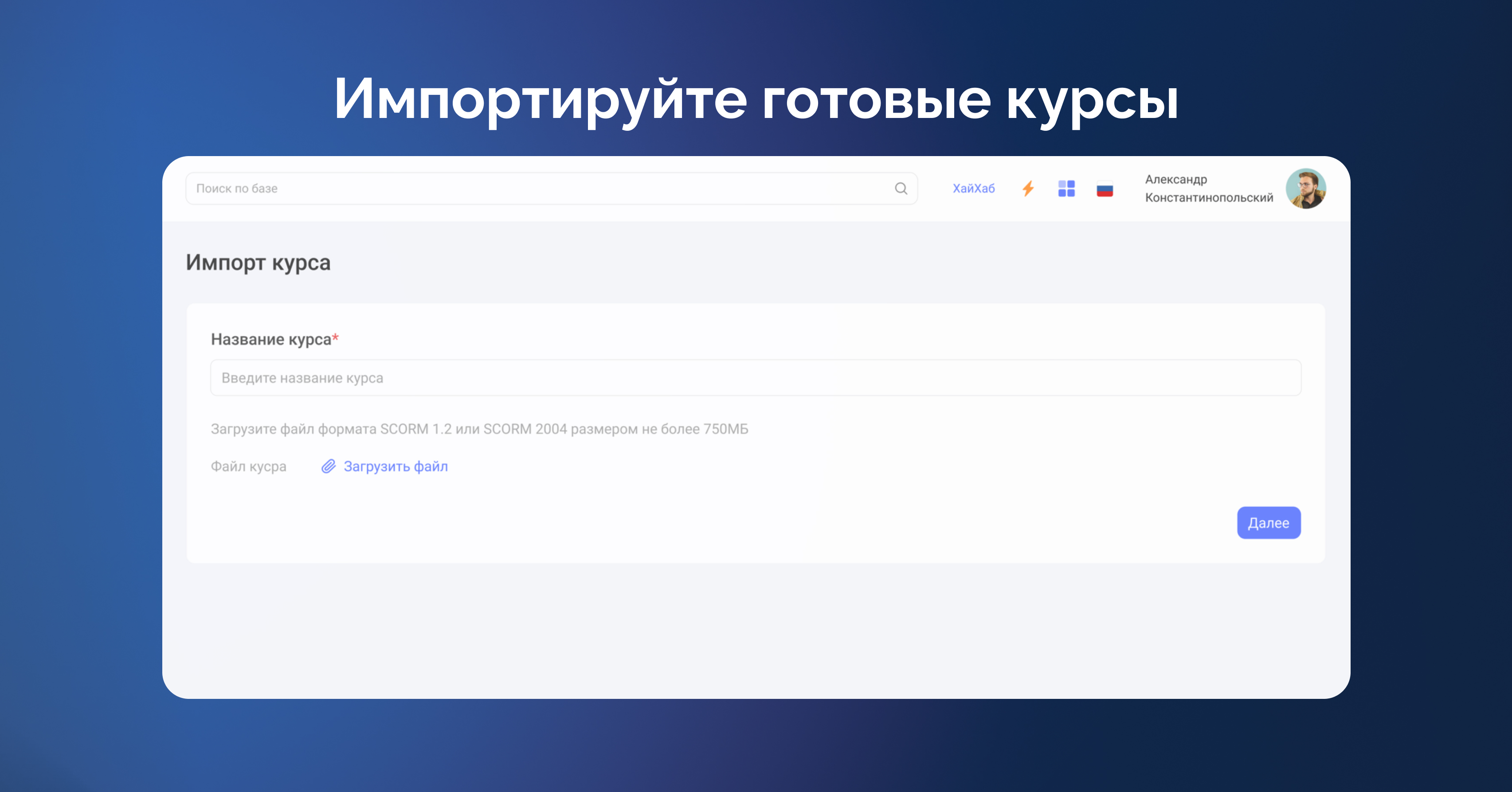 Помимо возможности создания курсов в редакторе, вы можете загружать готовые курсы в форматах SCORM 1.2 и SCORM 2004.
