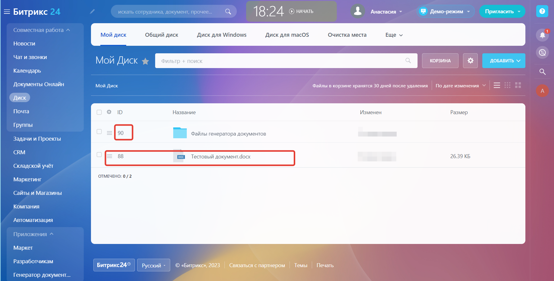 Обратите внимание на поле ID рядом с загруженным шаблоном. Оно будет использовано в настройках Генератора. Если столбец ID скрыт, включите его отображение в настройках.