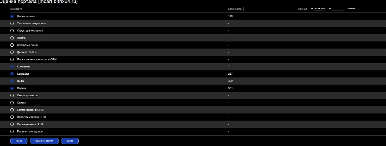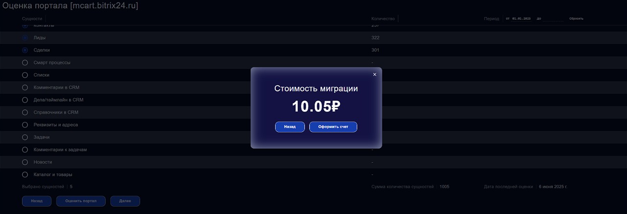 Миграция с помощью приложения мигратор возможна только на чистый портал. Это важно, так как миграция на портал с уже созданными сущностями может пройти некорректно. При необходимости переноса сущностей на уже заполненный портал советуем обратиться к намим специалистам