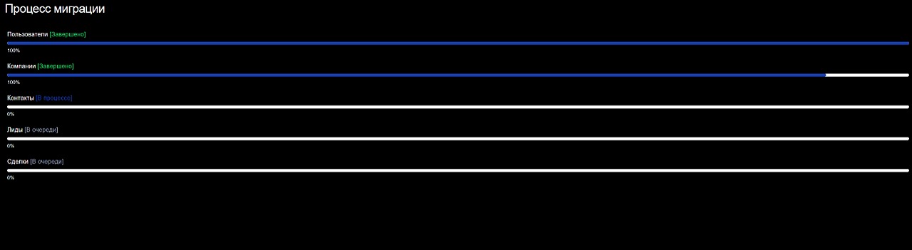 Перенос данных CRM: лиды, контакты, компании, сделки, статусы и направления сделок, пользовательские поля CRM.