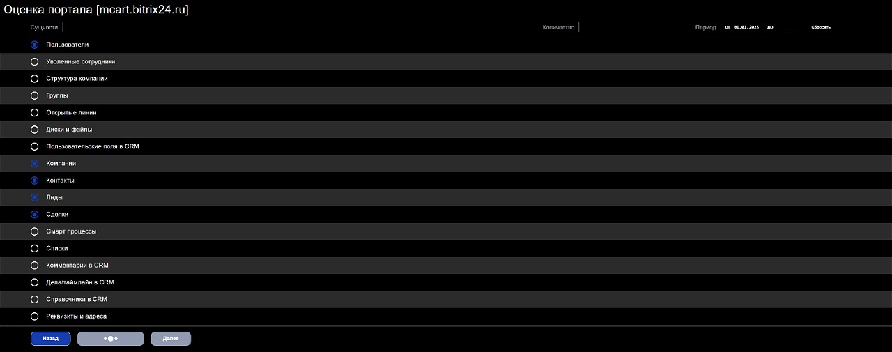 Приложение “Мигратор” от Эм Си Арт — это отличное решение для порталов с небольшим количеством сущностей. Т.к оно помогает безопасно и бесшовно перенести данные между облачной и коробочной версиями Битрикс24 с сохранением всех связей и структур.