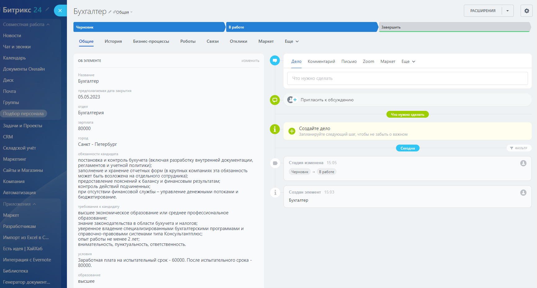 Вы хотите найти лучших кандидатов быстрее и с меньшими усилиями? Наше приложение - это лучшее решение! Оно позволяет Вам создавать и отслеживать вакансии, работать с откликами, менять их стадии и вести коммуникацию в рамках конкретной вакансии или отклика. Весь процесс реализуется на базе Битрикс 24.