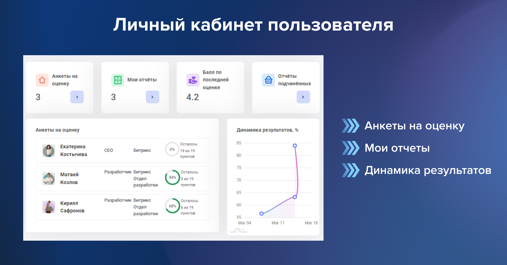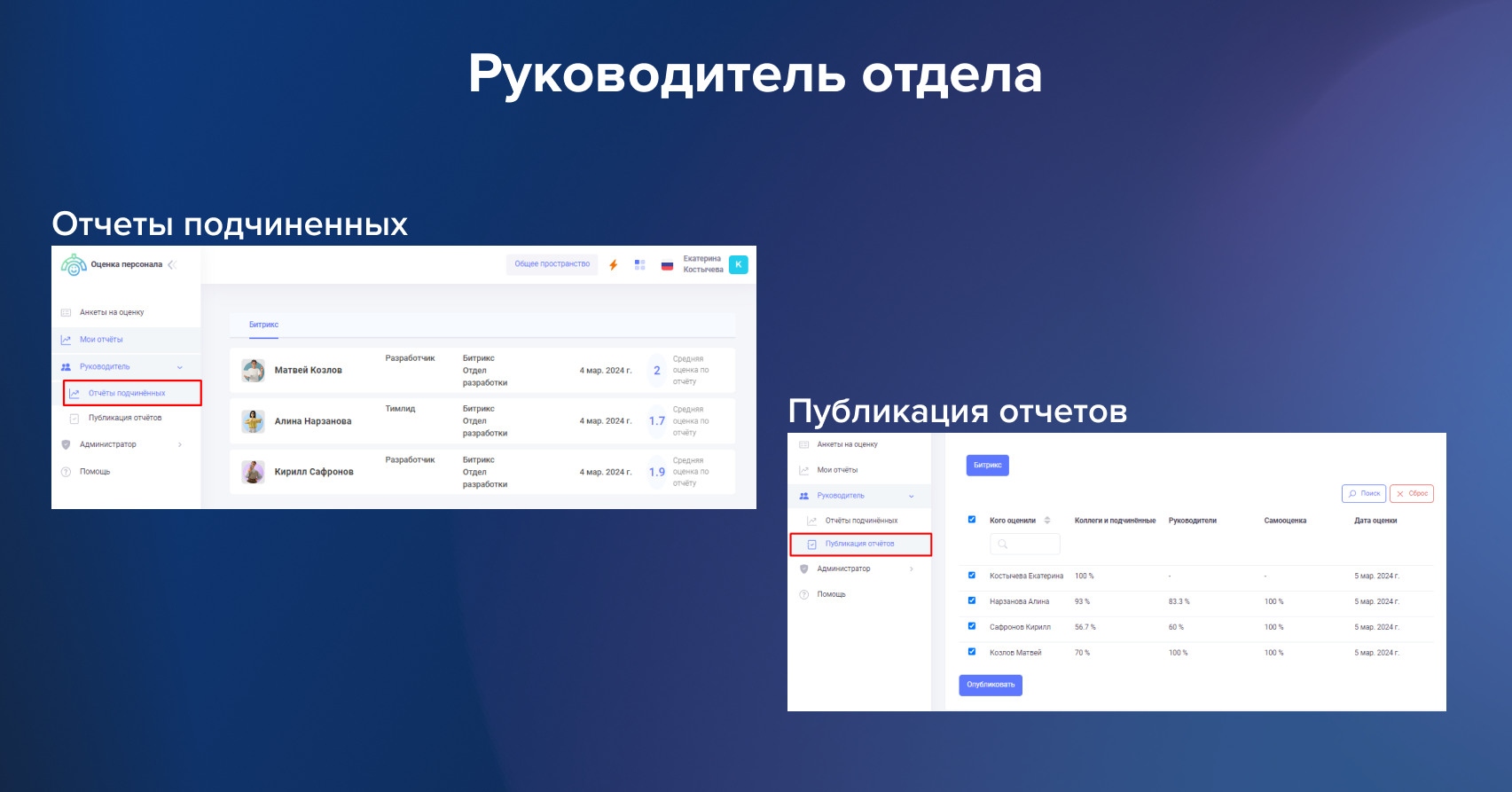 ✅ Руководитель отдела — оценивает анкеты подчиненных, имеет доступ к анкетам подчиненных, может публиковать отчеты подчиненных.