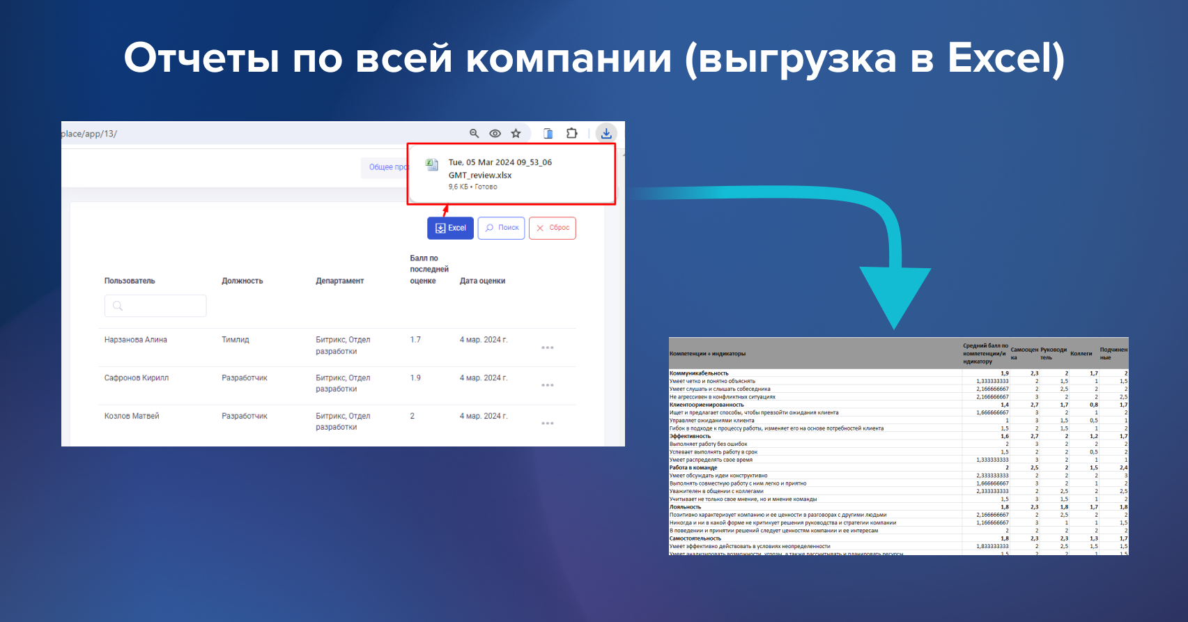 - Выгрузка отчетов в формате Excel Администратором: аналитика по всей компании и детальный отчет по сотруднику