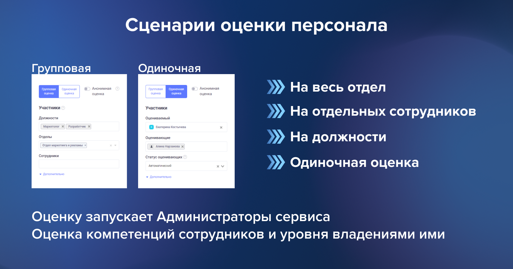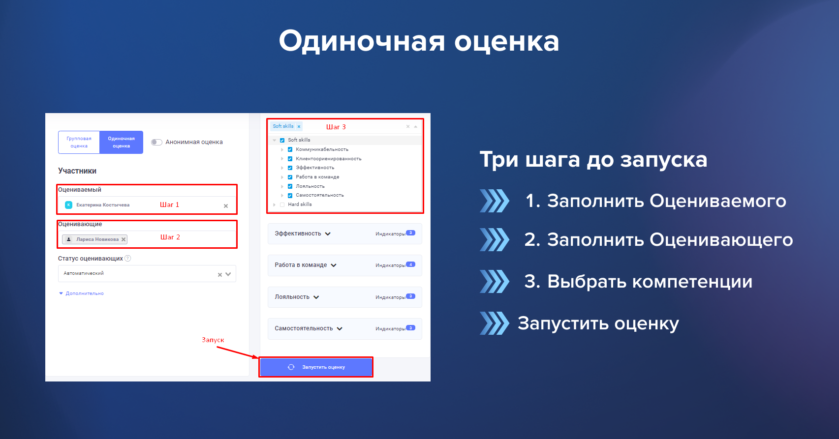 - Одиночная оценка — Администратор самостоятельно выбирает оцениваемого и оценивающих, выбирает набор компетенций, по которым производится запуск