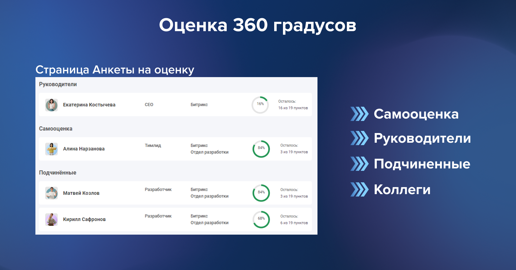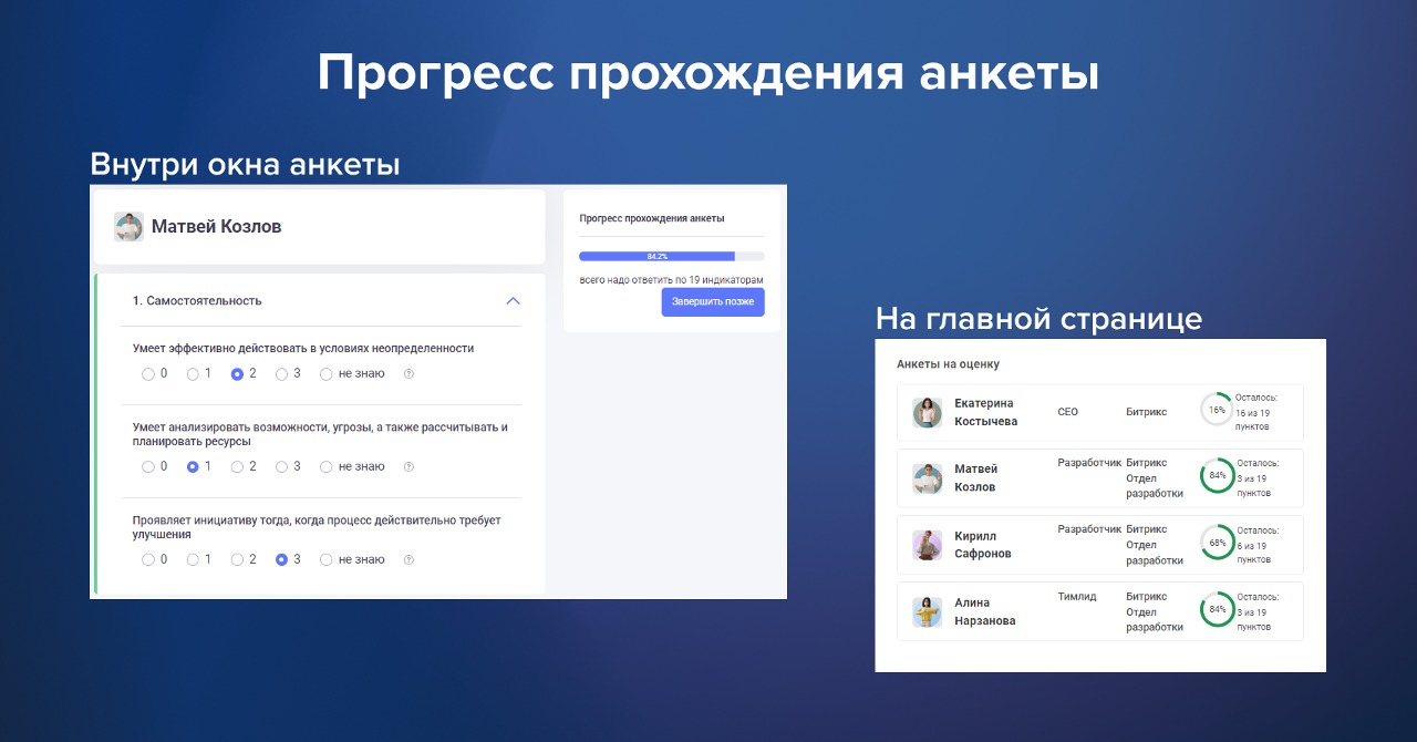 Все сотрудники, которые привязаны к отделу, увидят в своем профиле анкеты на оценку: коллег, руководителя и себя. Остальные сотрудники получат только анкеты на оценку коллег из выбранного отдела.