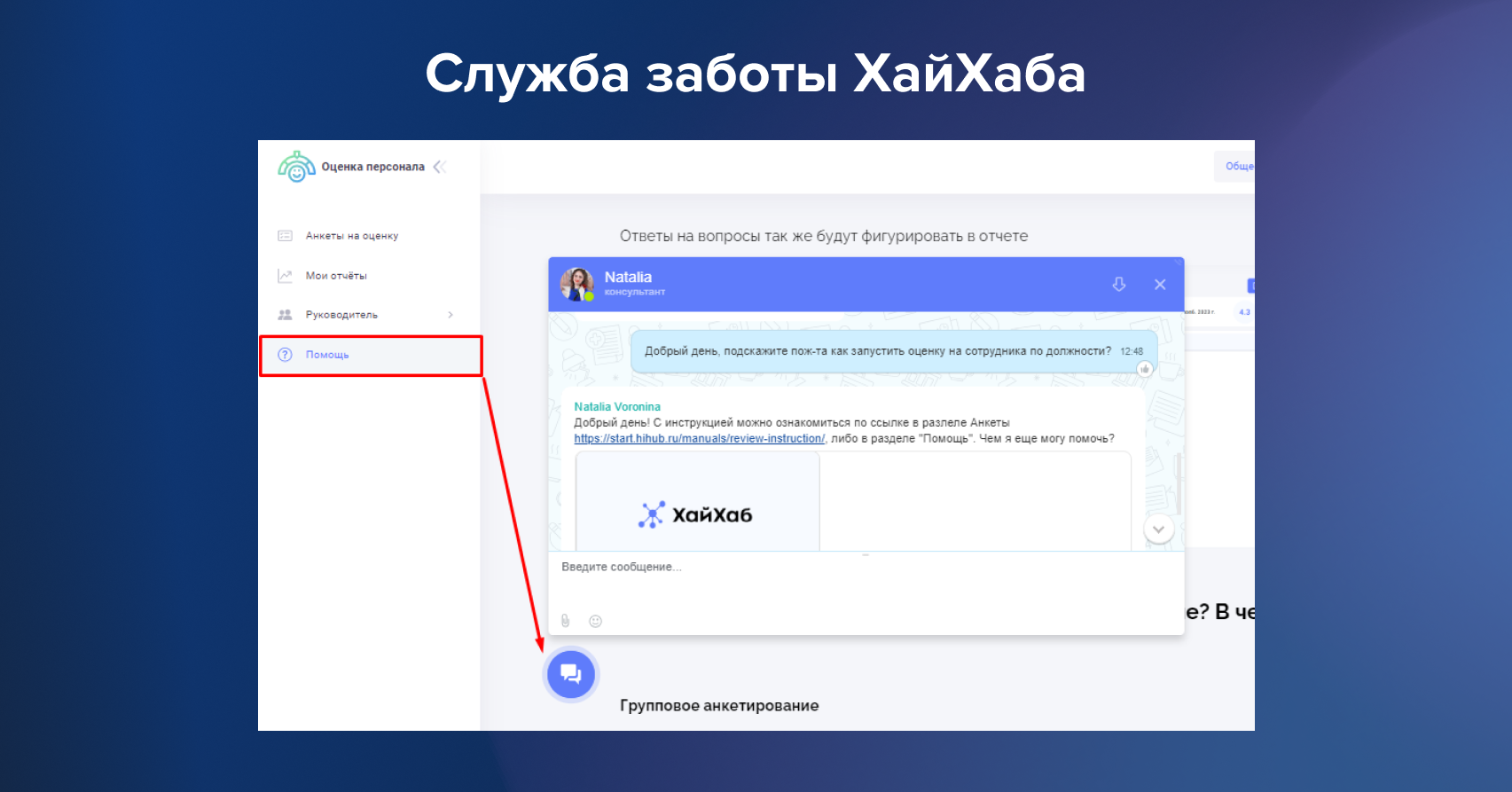 - Виджет «Служба заботы ХайХаба» в разделе поддержки. Поможем разобраться с функционалом или другим вопросом по запуску оценки персонала