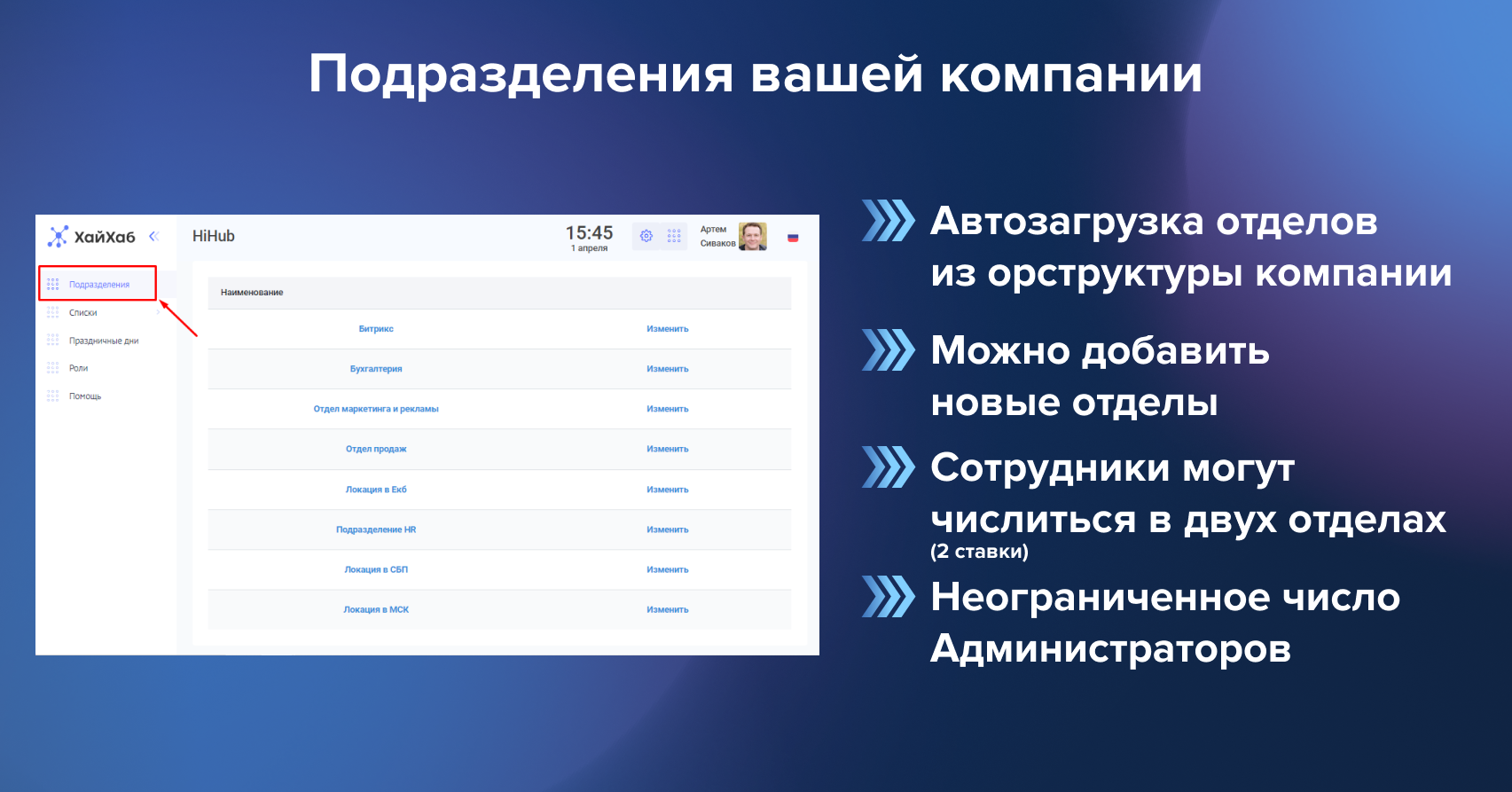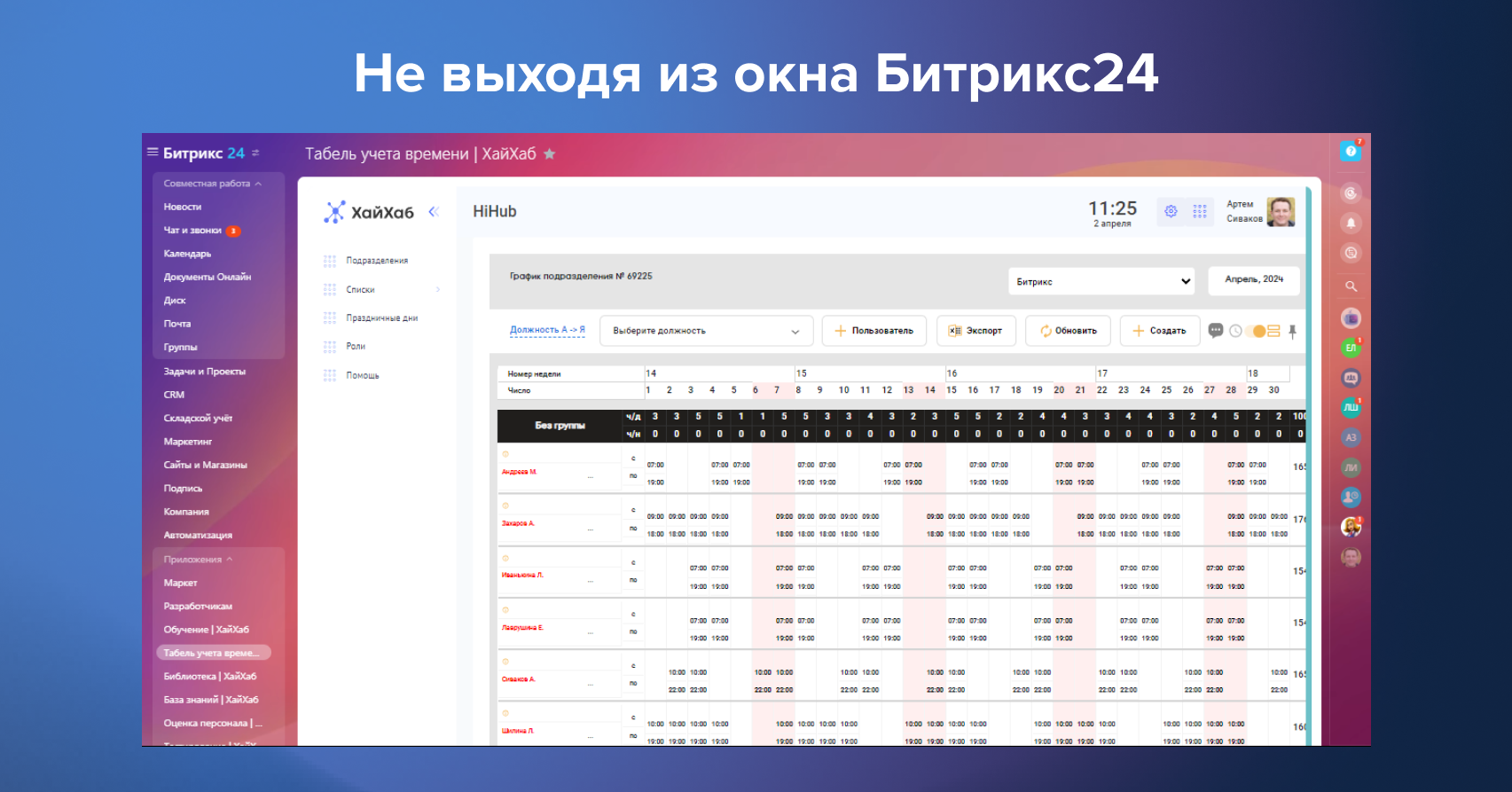 Сразу после установки отделы и сотрудники вашей компании будут автоматически добавлены в ХайХаб. Вы сможете создать шаблоны графиков работы (2/2, 5/2, 4/2 и др.) и прикрепить к каждому сотруднику.