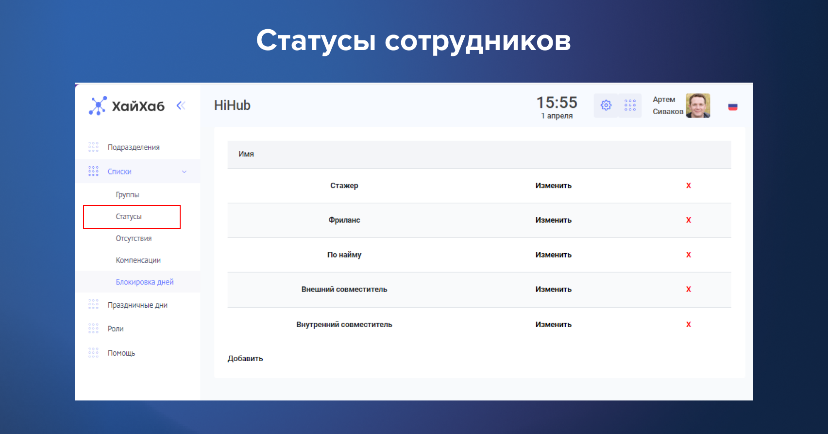Статусы — заполняются, если необходимо указать статус сотрудника «Стажер», «Пробная смена», «Совместитель» и др.
