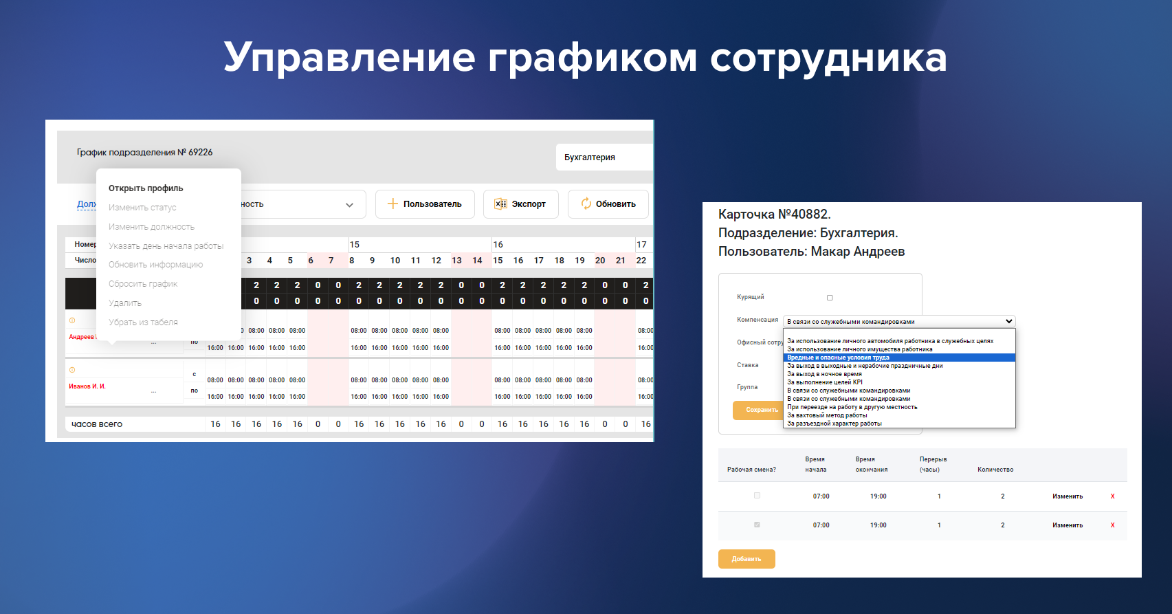 Формируйте индивидуальные графики работы, настраивайте время начала и конца рабочего дня. Если смена попадает в промежуток с 00:00 до 06:00, то она считается ночной. Можно выделять цветом смены и оставлять комментарии – это поможет не упустить важную информацию.