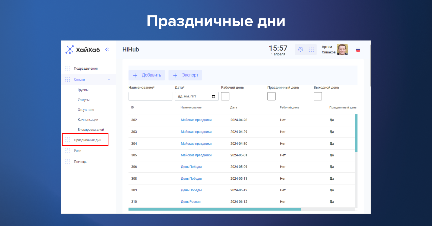 - Праздничные дни — дополнительные дни для формирования корректной выгрузки отчетов, участвуют при расчете смен для офисных сотрудников
