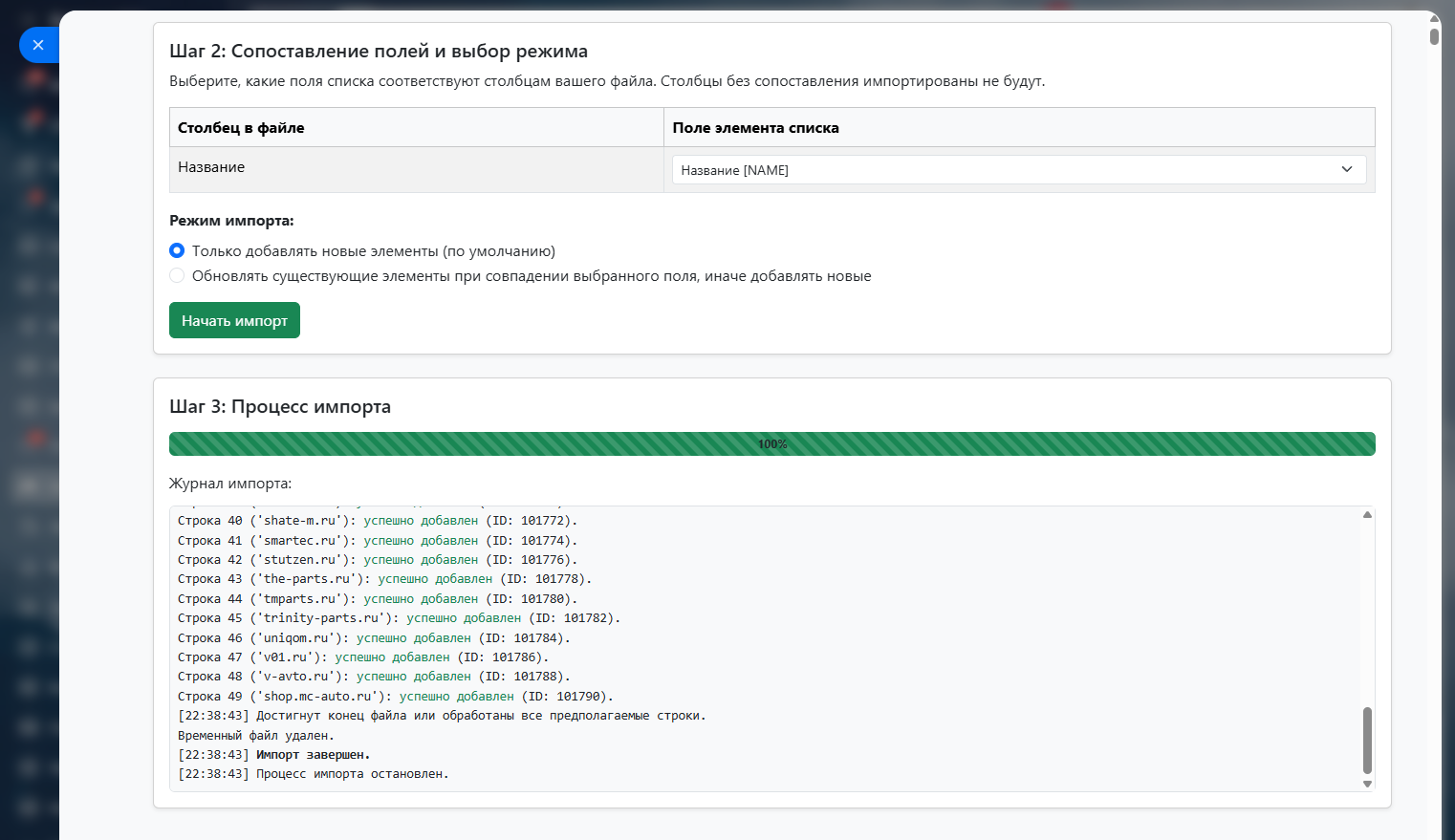 - Гибкость: Возможность выбора режима импорта и работа с различными типами списков.