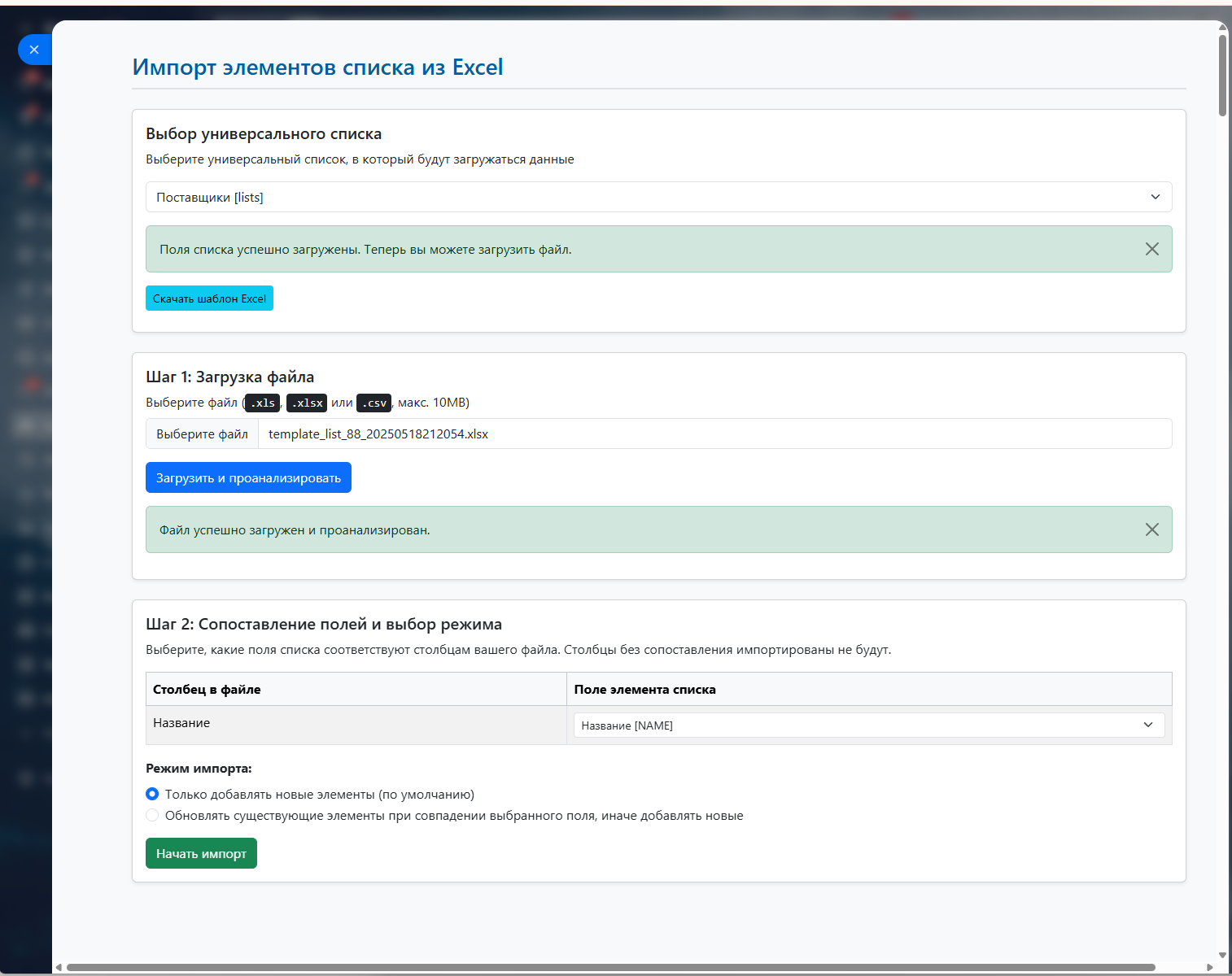 - Обновление и добавление: Приложение может обновлять существующие элементы списка, если найдено совпадение по ключевому полю (выбирается первый сопоставленный столбец файла), или добавлять новые, если совпадений нет.