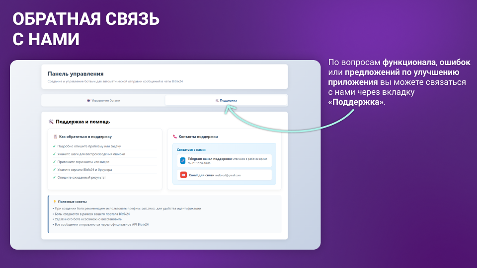 Приложение особенно полезно компаниям, которые хотят быстро и автоматически информировать сотрудников о важных событиях, задачах или внутренних процессах через чат или группы, используя настраиваемые сообщения с кнопками и переменными.