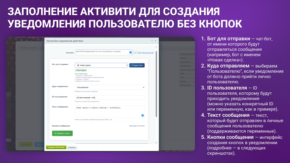 В тексте сообщений и ссылках можно использовать переменные бизнес-процессов для динамического формирования уведомлений.