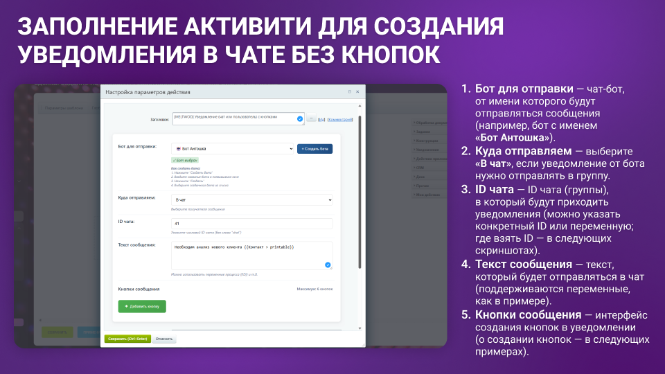 Приложение позволяет автоматически отправлять сообщения в чат пользователя или группу от имени бота, с возможностью добавления кнопок со ссылками, используя переменные бизнес-процесса.