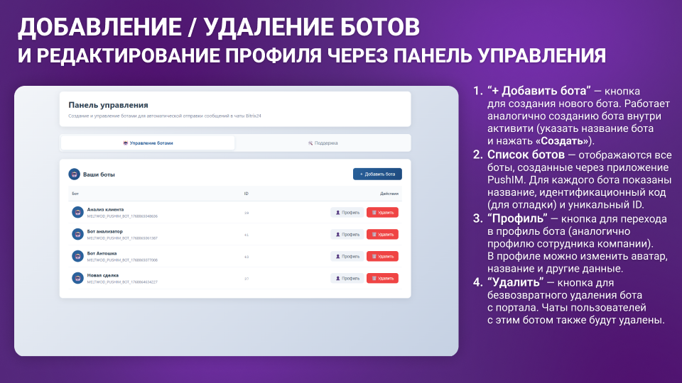 Панель управления позволяет гибко работать с ботами: создавать, удалять и настраивать их.
