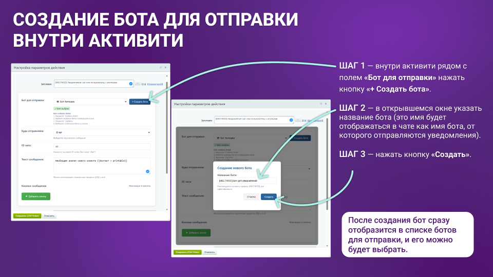 Активити избавляет от ручной отправки уведомлений, снижает количество ошибок и обеспечивает единый стандарт коммуникаций внутри команды.