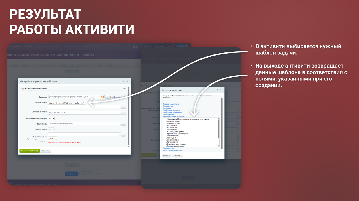 • В БП при смене этапа сделки срабатывает активити выбора шаблона, данные передаются в активити создания задачи — задача создаётся автоматически.