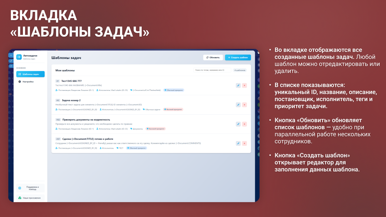 Чтобы сотрудники не копировали вручную одни и те же задачи: по сделке, по этапу, по лиду. Достаточно выбрать шаблон и при необходимости подправить данные — задача создаётся с нужным исполнителем, сроками и привязкой к элементу CRM.