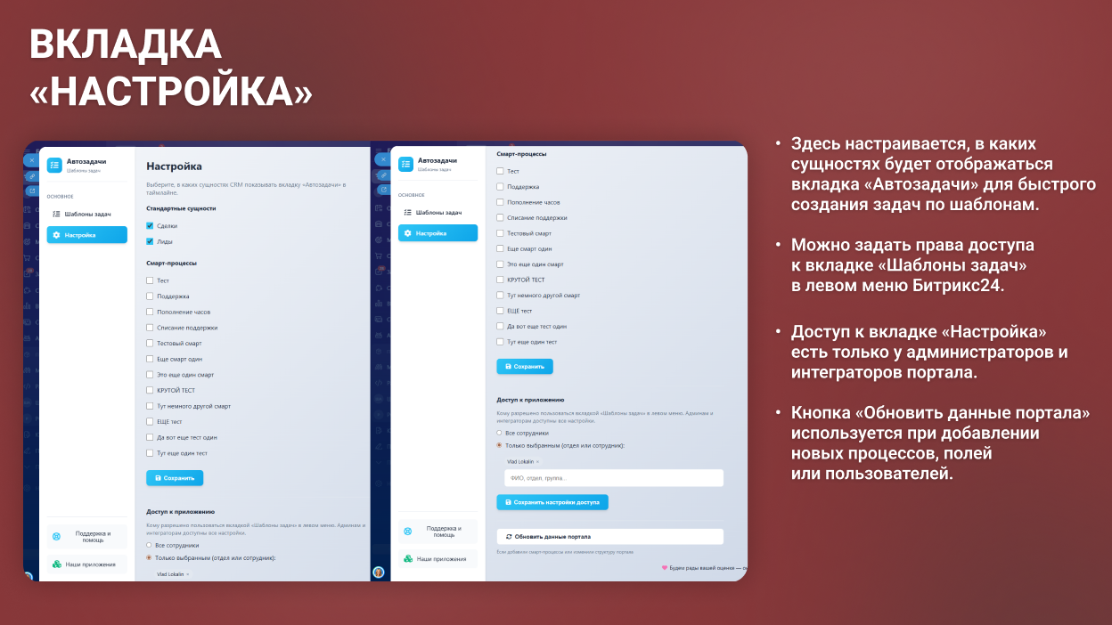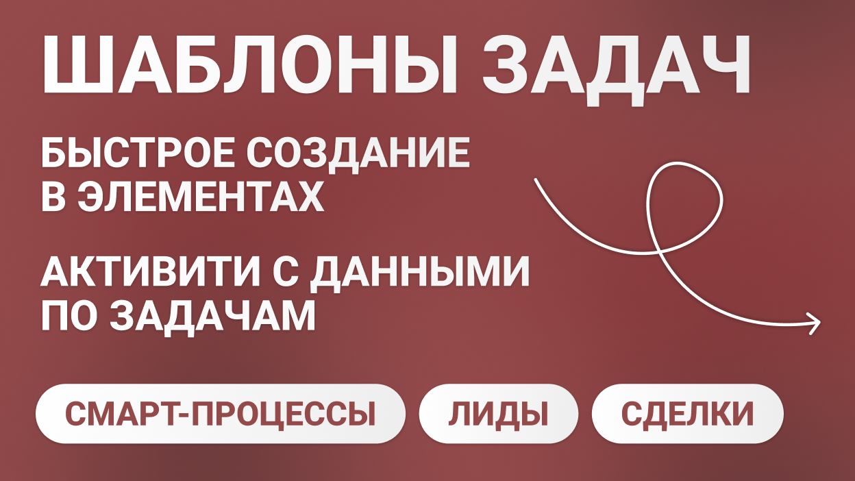 «Автозадачи: Быстрый запуск шаблонов задач» — приложение для создания задач по готовым шаблонам. Шаблоны настраиваются один раз, затем по ним создаются задачи из карточки сделки, лида или смарт-процесса, а также из бизнес-процессов.