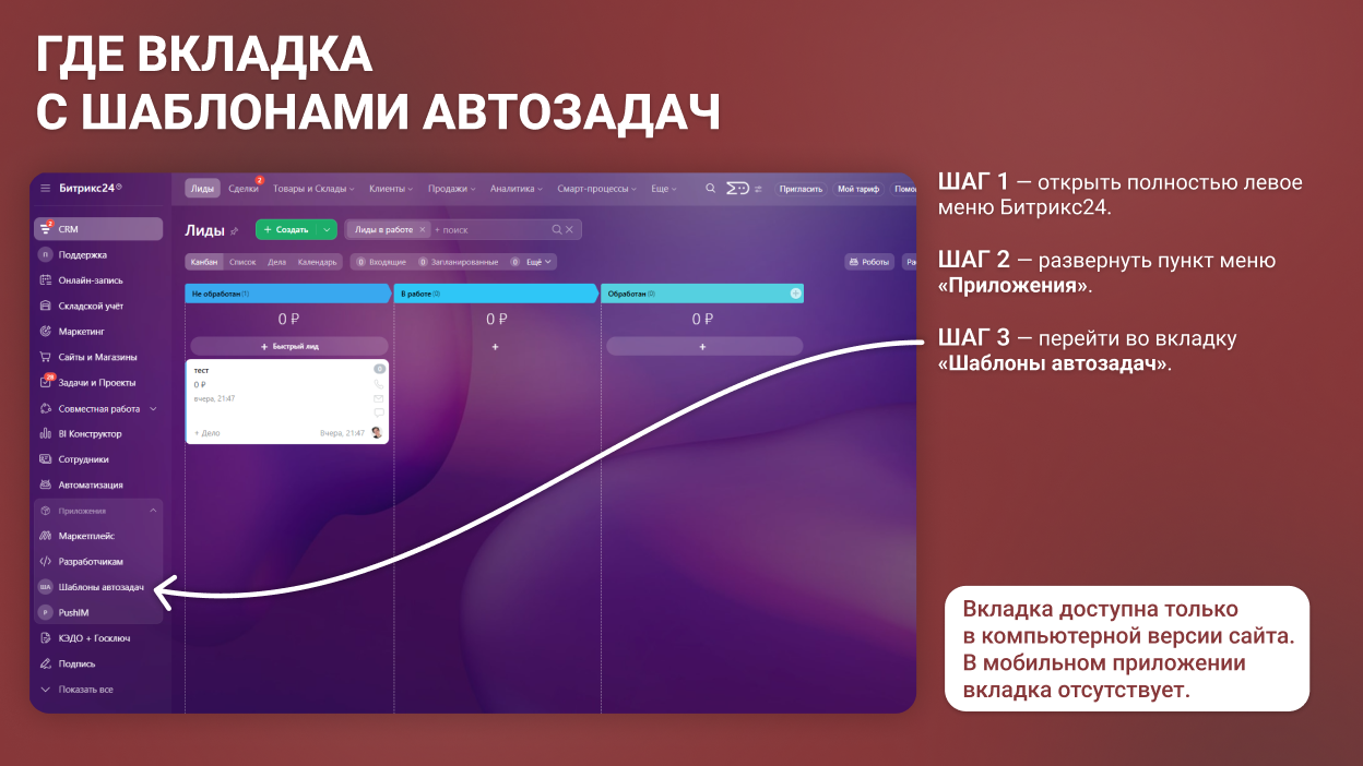 В карточках сделок, лидов и смарт-процессов доступна вкладка «Автозадачи» — выбор шаблона и создание задачи в один клик с привязкой к элементу.