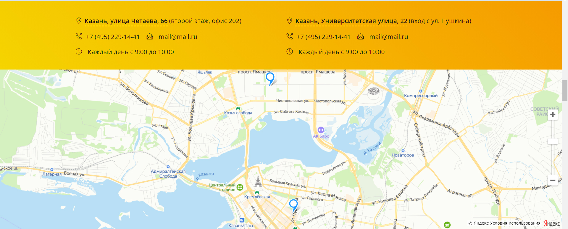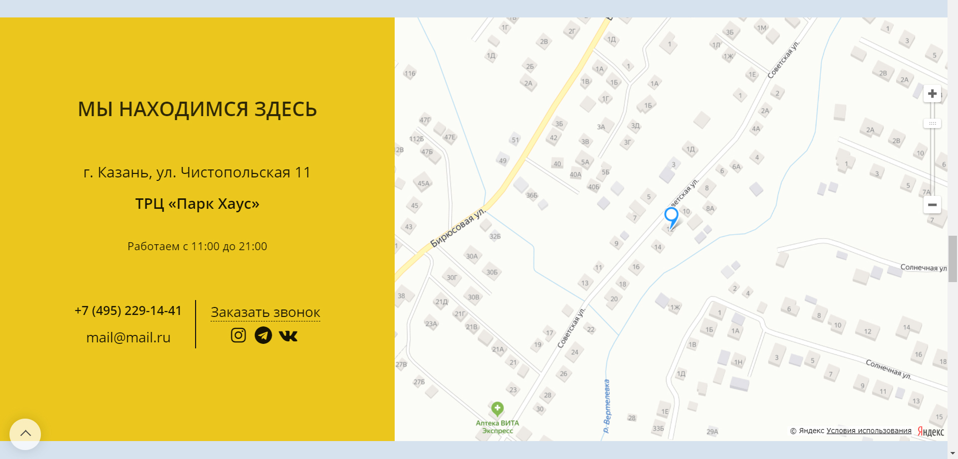 Приложение добавляет 8 блоков с контактной информацией на Яндекс.Картах. Есть блоки для любого масштаба бизнеса, от 1 единственного офиса до сети филиалов по всей стране.
