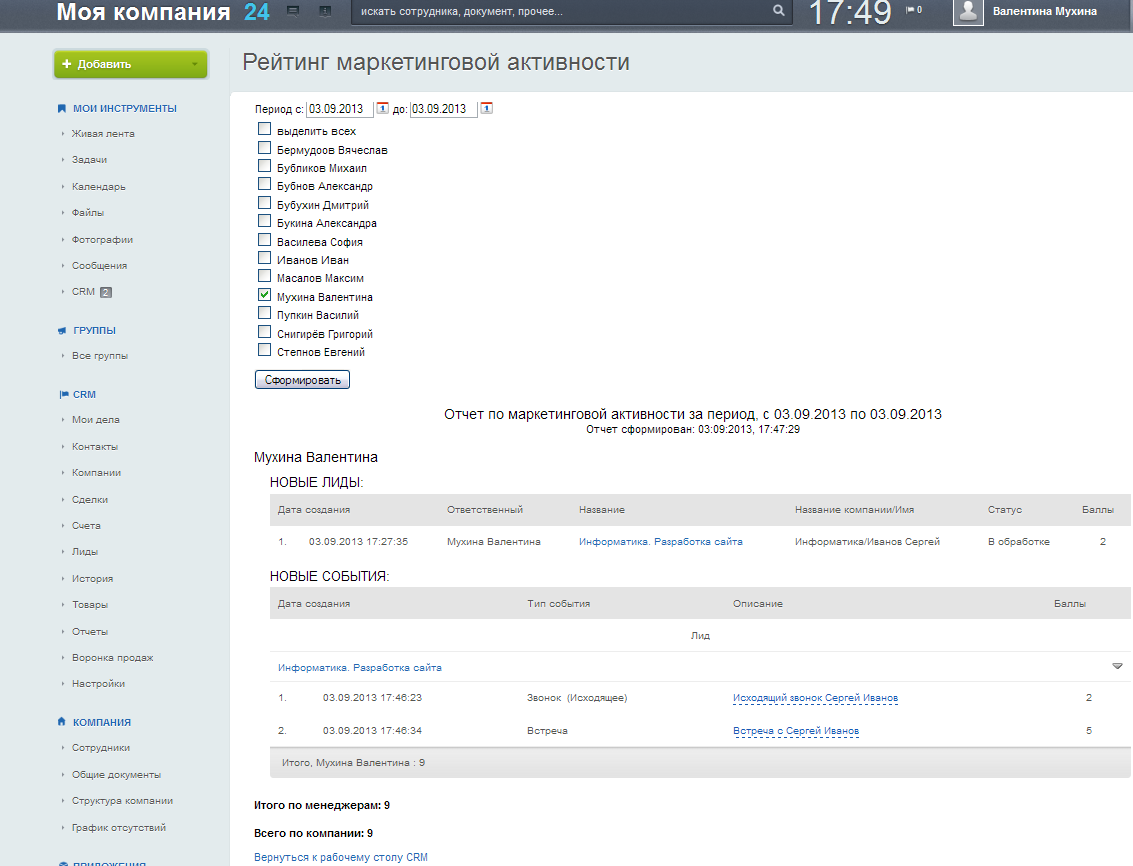 Отображает рабочую, маркетинговую активность менеджеров, работающих с CRM, способствует повышению не только соревновательной и конкурентной составляющей между ними, но и предоставляет возможность оперативного контроля полноты и качества взаимодействия с клиентами, путем просмотра детальных отчетов по работе менеджеров удобно на одном экране.