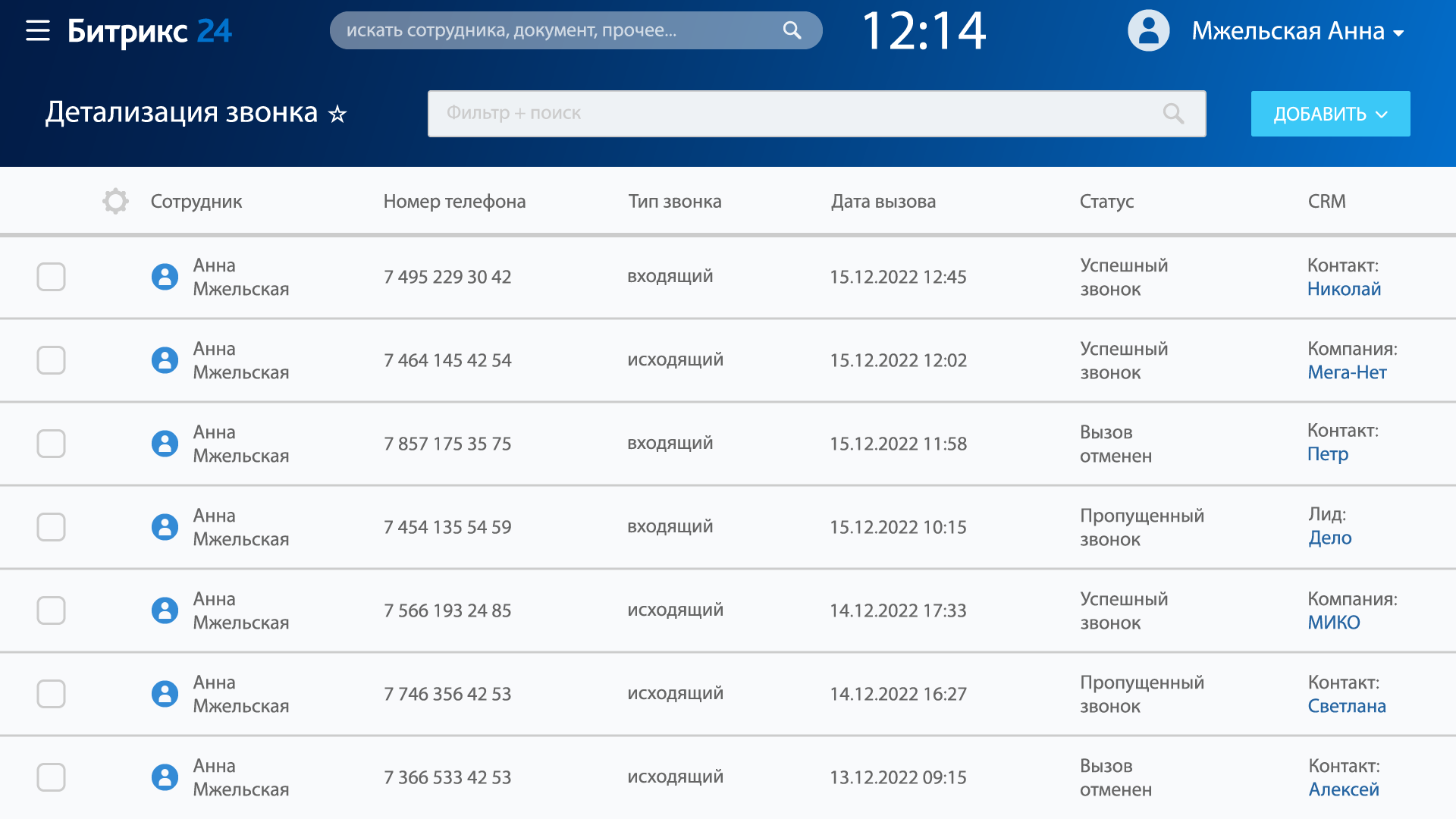- Все звонки в компанию хранятся в списке Детализация звонков с привязкой к CRM сущностям