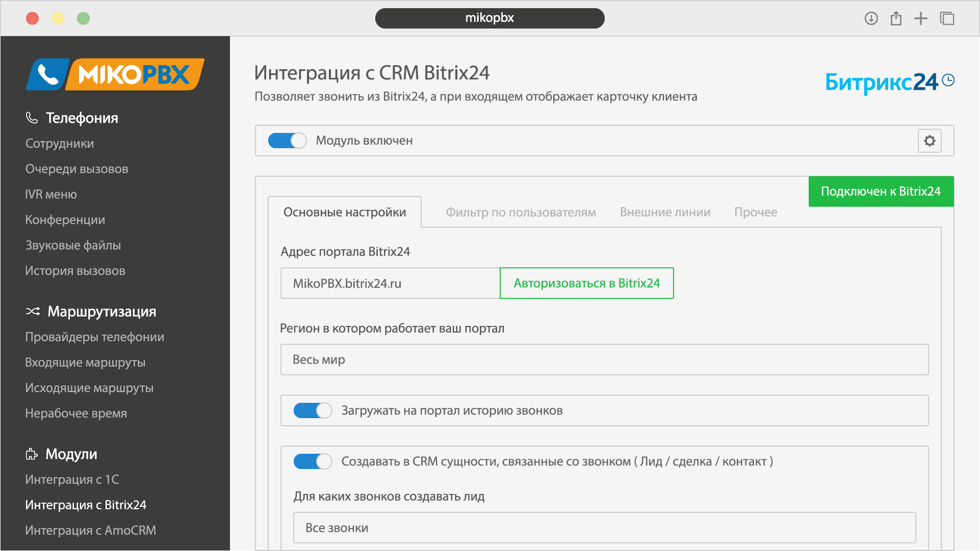 Интеграция с бесплатной АТС MIKOPBX на Asterisk