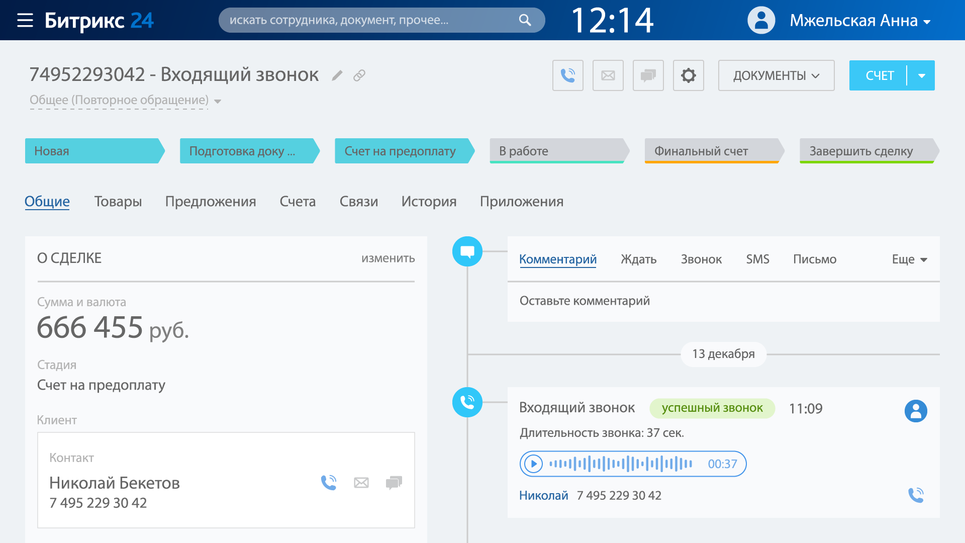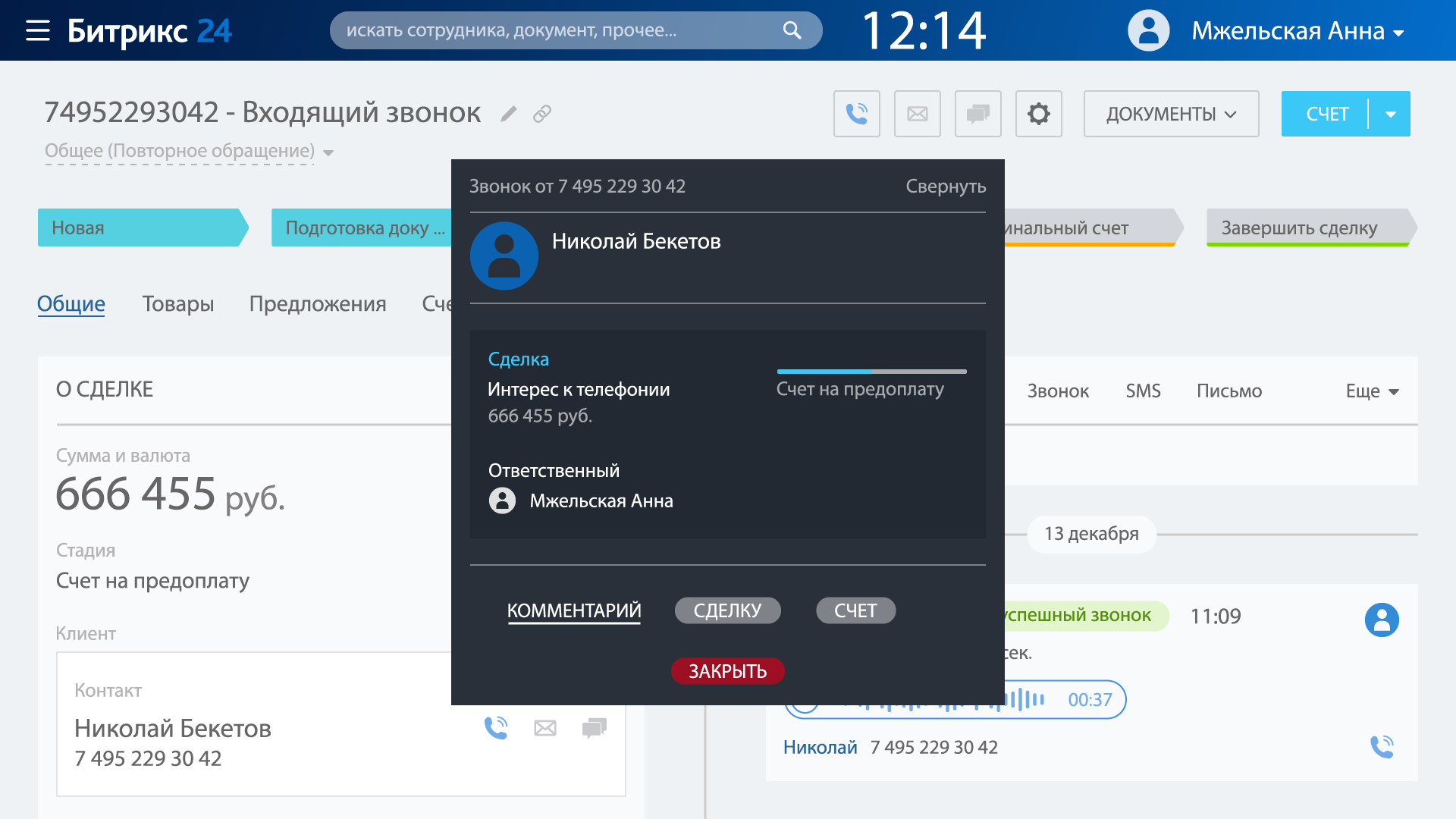 - Показывает текущие Сделки по определившемуся номеру телефона