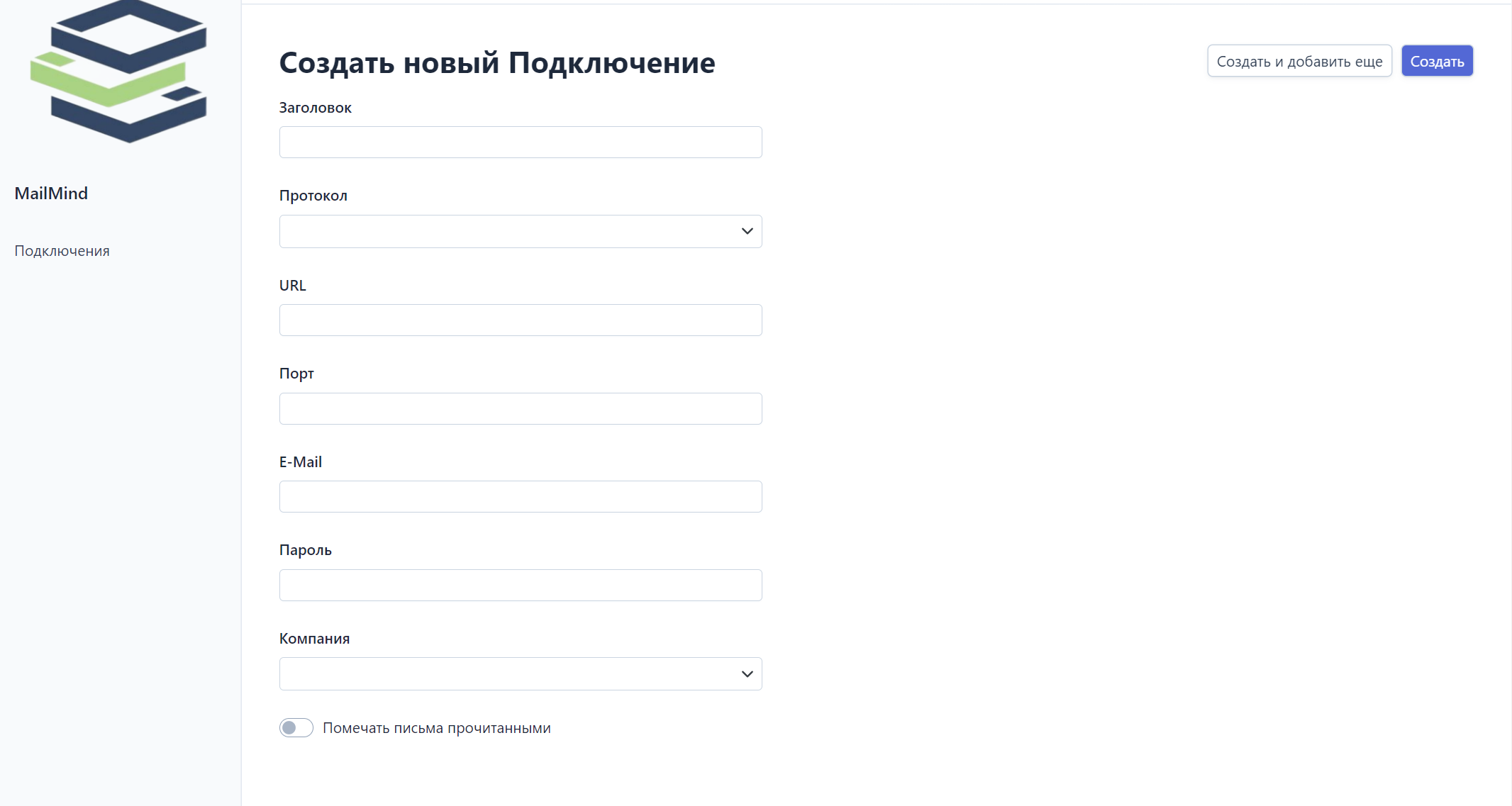 3. В lk.mailmind.ru необходимо создать подключение почты для парсинга