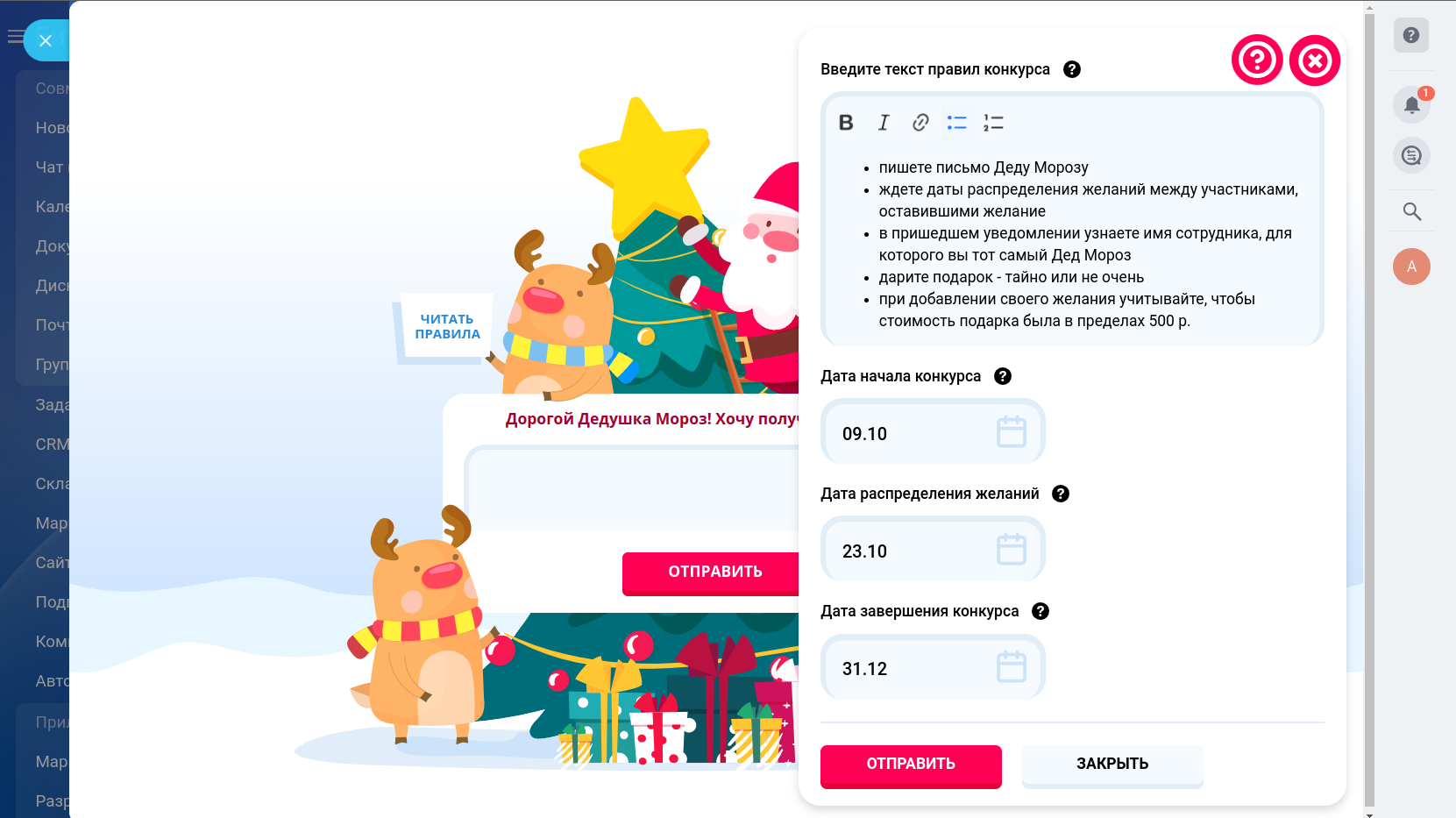 Шаг 2: Переходите в приложение по ссылке из бокового меню и заполняете несколько полей: даты старта, распределения и завершения и прописываете правила — настройка окончена, дальше всё сделает наше приложение.