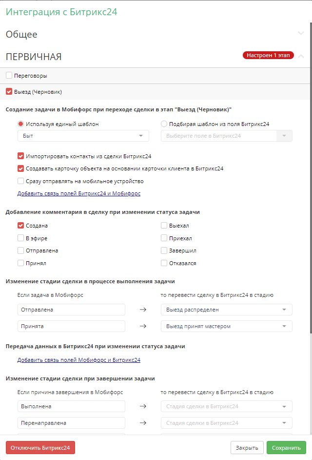 Данное приложение помогает интегрировать Мобифорс со сделками Битрикс24, обеспечивая передачу всей необходимой информации из сделки в задачу сотрудника и возврат данных отчета сотрудника назад в Битрикс24.